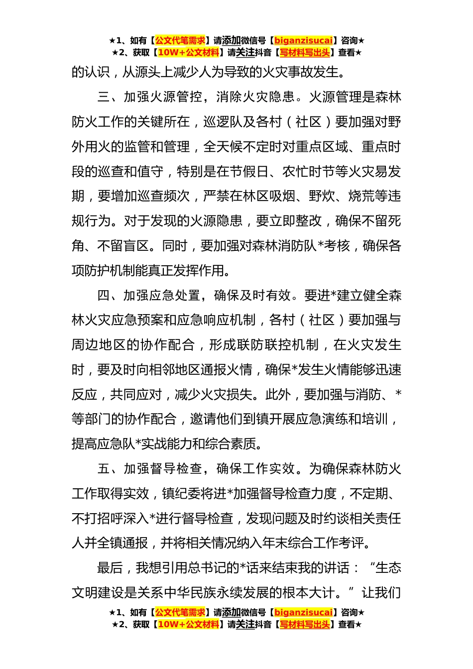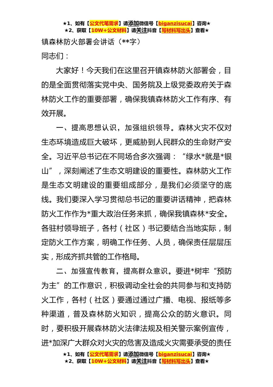 ★1、如有【公文代笔需求】请添加微信号【biganzisucai】咨询★★2、获取【10W+公文材料】请关注抖音【写材料写出头】查看★镇森林防火部署会讲话(**字)同志们:大家好!今天我们在这里召开镇森林防火部署会,目的是全面贯彻落实党中央、国务院及上级党委政府关于森林防火工作的重要部署,确保我镇森林防火工作有序、有效开展。一、提高思想认识,加强组织领导。森林火灾不仅对生态环境造成巨大破坏,更威胁到人民群众的生命财产安全。习近平总书记在不同场合多次强调:“绿水*就是*银山”,深刻阐述了生态文明建设的重要性。森林防火工作是生态文明建设的重要组成部分,是我们必须坚守的底线。我们要深入学习贯彻总书记的重要讲话精神,把森林防火工作作为*重大政治任务来抓,确保我镇森林*安全。各驻村领导班...