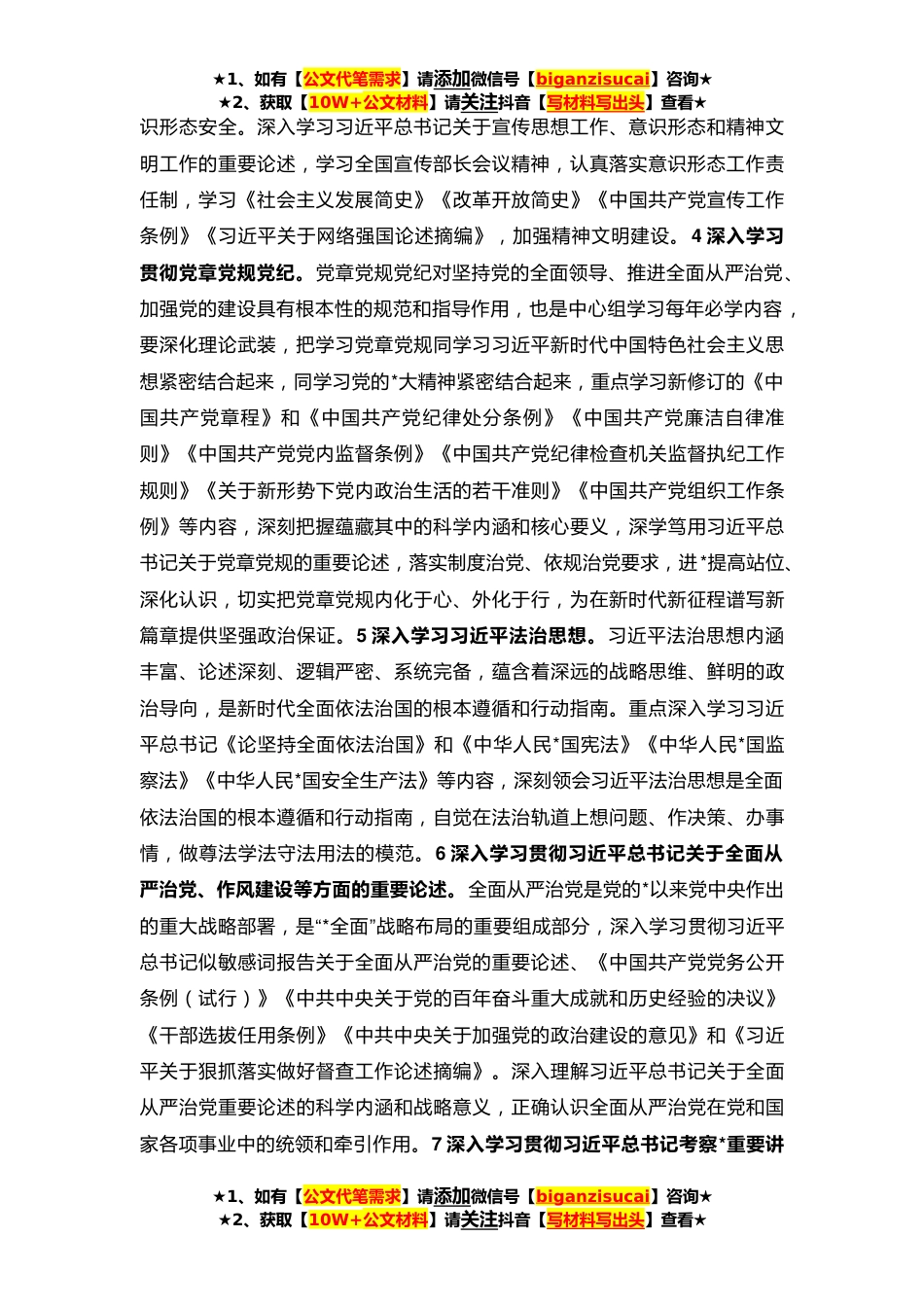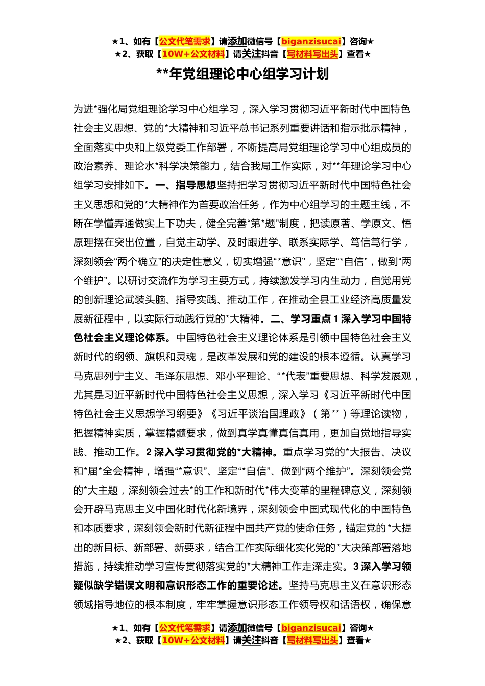 ★1、如有【公文代笔需求】请添加微信号【biganzisucai】咨询★★2、获取【10W+公文材料】请关注抖音【写材料写出头】查看★**年党组理论中心组学习计划为进*强化局党组理论学习中心组学习,深入学习贯彻习近平新时代中国特色社会主义思想、党的*大精神和习近平总书记系列重要讲话和指示批示精神,全面落实中央和上级党委工作部署,不断提高局党组理论学习中心组成员的政治素养、理论水*科学决策能力,结合我局工作实际,对**年理论学习中心组学习安排如下。一、指导思想坚持把学习贯彻习近平新时代中国特色社会主义思想和党的*大精神作为首要政治任务,作为中心组学习的主题主线,不“断在学懂弄通做实上下功夫,健全完善第*”题制度,把读原著、学原文、悟原理摆在突出位置,自觉主动学、及时跟进学、联系实际学...