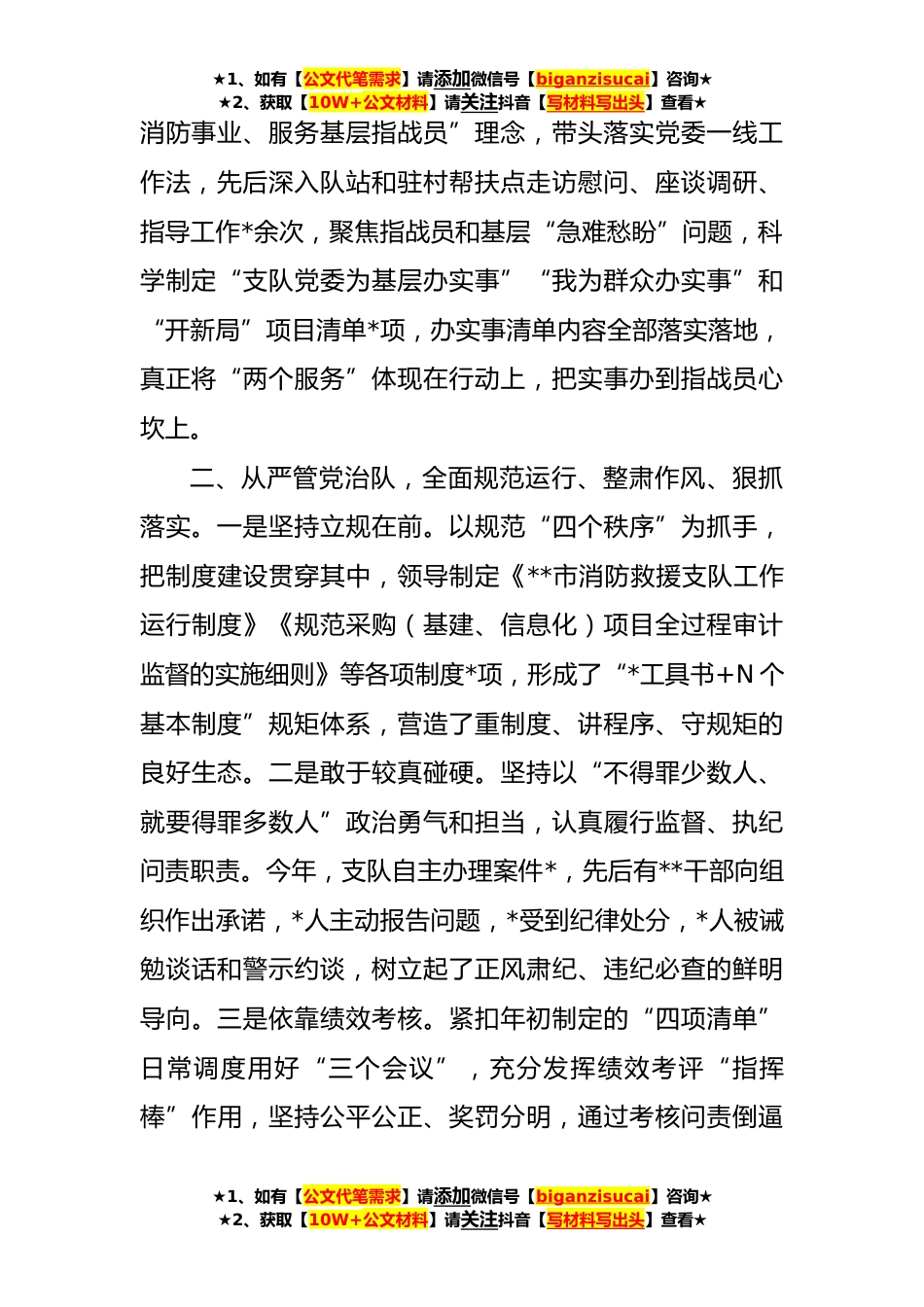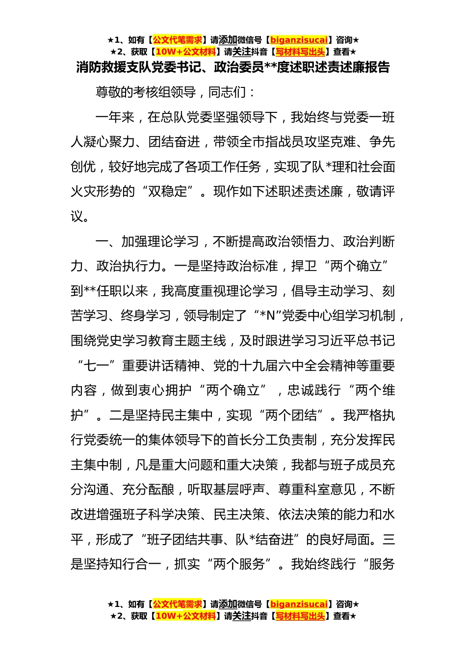 ★1、如有【公文代笔需求】请添加微信号【biganzisucai】咨询★★2、获取【10W+公文材料】请关注抖音【写材料写出头】查看★消防救援支队党委书记、政治委员**度述职述责述廉报告尊敬的考核组领导,同志们:一年来,在总队党委坚强领导下,我始终与党委一班人凝心聚力、团结奋进,带领全市指战员攻坚克难、争先创优,较好地完成了各项工作任务,实现了队*理和社会面火灾形势的“双稳定”。现作如下述职述责述廉,敬请评议。一、加强理论学习,不断提高政治领悟力、政治判断力、政治执行力。一是坚持政治标准,捍卫“两个确立”到**任职以来,我高度重视理论学习,倡导主动学习、刻苦学习、终身学习,领导制定了“*N”党委中心组学习机制,围绕党史学习教育主题主线,及时跟进学习习近平总书记“七一”重要讲话精神...