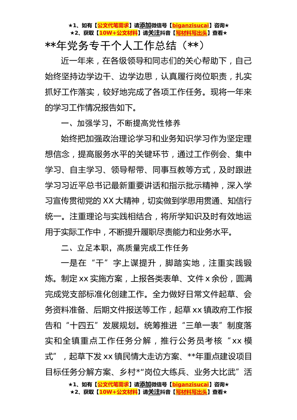 ★1、如有【公文代笔需求】请添加微信号【biganzisucai】咨询★★2、获取【10W+公文材料】请关注抖音【写材料写出头】查看★**年党务专干个人工作总结(**)近一年来,在各级领导和同志们的关心帮助下,自己始终坚持边学边干、边学边思,认真履行岗位职责,扎实抓好工作落实,较好地完成了各项工作任务。现将一年来的学习工作情况报告如下。一、加强学习,不断提高党性修养始终把加强政治理论学习和业务知识学习作为坚定理想信念,提高服务水平的关键环节,通过工作例会、集中学习、自主学习、领导帮带、同事互教等方式,及时跟进学习习近平总书记最新重要讲话和指示批示精神,深入学习宣传贯彻党的XX大精神,切实做到学思用贯通、知信行统一。注重理论与实践相结合,将所学知识及时有效地运用于实际工作中,不断...