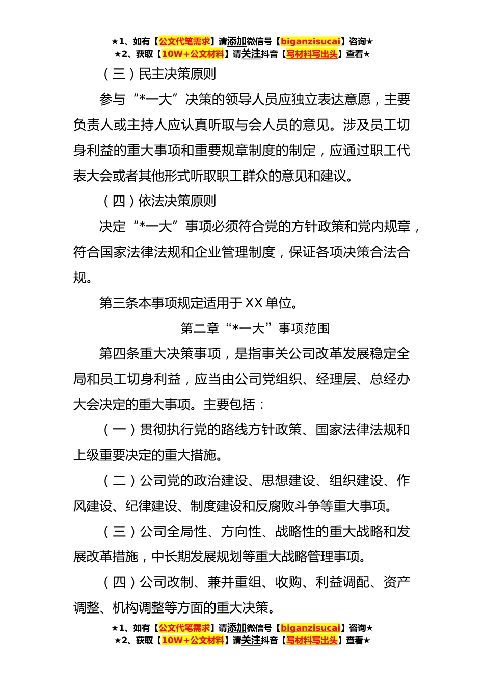 ★1、如有【公文代笔需求】请添加微信号【biganzisucai】咨询★★2、获取【10W+公文材料】请关注抖音【写材料写出头】查看★企业贯彻落实“*一大”决策制度实施细则(**字)为深入学习贯彻习近平新时代中国特色社会主义思想,全面落实全国国有企业党的建设工作会议部署,特别是习近平总书记“两个一以贯之”的重要要求,把加强党的领导和完善公司治理统一起来,进一步规范企业决策行为、提高决策水平、防范决策风险,根据《关于进一步推进国有企业贯彻落实“*一大”决策制度的意见》《国有资产监管条例》以及上级党委等规定,结合公司实际,制定本事项规定。第一章总则第一条本细则所称“*一大”事项是指重大决策、重要人事任免、重大项目安排和大额度资金运作事项。第二条“*一大”事项的决策必须坚持以下原则:...