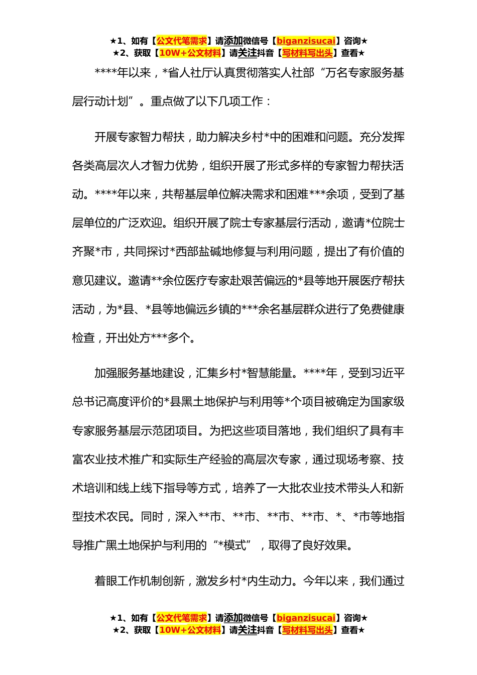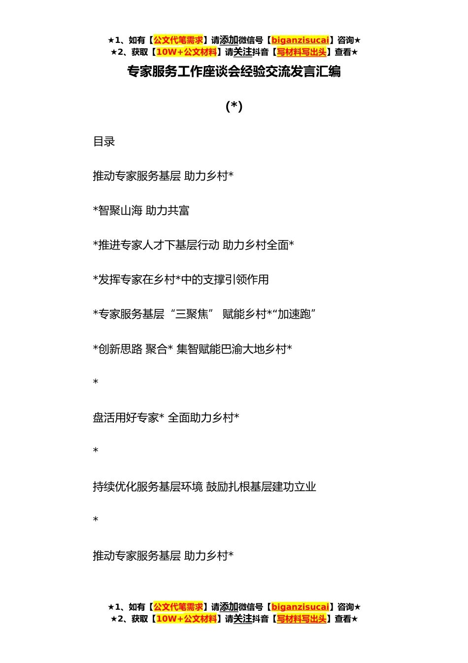 ★1、如有【公文代笔需求】请添加微信号【biganzisucai】咨询★★2、获取【10W+公文材料】请关注抖音【写材料写出头】查看★专家服务工作座谈会经验交流发言汇编(*)目录推动专家服务基层助力乡村**智聚山海助力共富*推进专家人才下基层行动助力乡村全面**发挥专家在乡村*中的支撑引领作用*专家服务基层“三聚焦”赋能乡村*“加速跑”*创新思路聚合*集智赋能巴渝大地乡村**盘活用好专家*全面助力乡村**持续优化服务基层环境鼓励扎根基层建功立业*推动专家服务基层助力乡村*★1、如有【公文代笔需求】请添加微信号【biganzisucai】咨询★★2、获取【10W+公文材料】请关注抖音【写材料写出头】查看★★1、如有【公文代笔需求】请添加微信号【biganzisucai】咨询★★2、获取【10W+公文材料】请关注抖音【写材料写出...