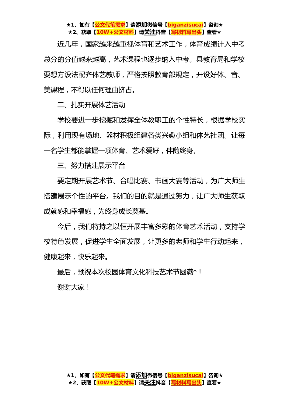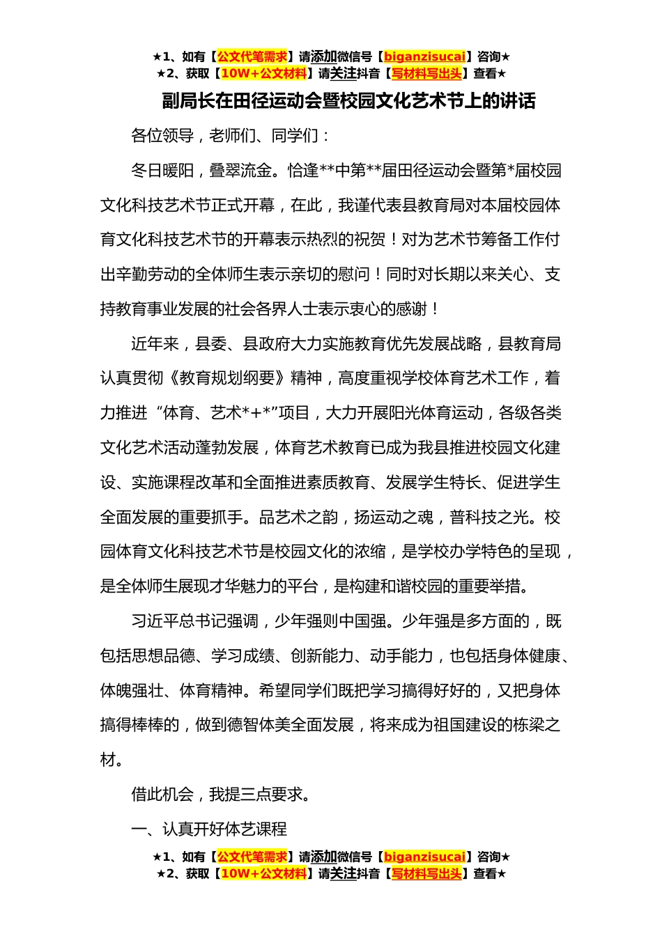 ★1、如有【公文代笔需求】请添加微信号【biganzisucai】咨询★★2、获取【10W+公文材料】请关注抖音【写材料写出头】查看★副局长在田径运动会暨校园文化艺术节上的讲话各位领导,老师们、同学们:冬日暖阳,叠翠流金。恰逢**中第**届田径运动会暨第*届校园文化科技艺术节正式开幕,在此,我谨代表县教育局对本届校园体育文化科技艺术节的开幕表示热烈的祝贺!对为艺术节筹备工作付出辛勤劳动的全体师生表示亲切的慰问!同时对长期以来关心、支持教育事业发展的社会各界人士表示衷心的感谢!近年来,县委、县政府大力实施教育优先发展战略,县教育局认真贯彻《教育规划纲要》精神,高度重视学校体育艺术工作,着力推进“体育、艺术*+*”项目,大力开展阳光体育运动,各级各类文化艺术活动蓬勃发展,体育艺术教育...