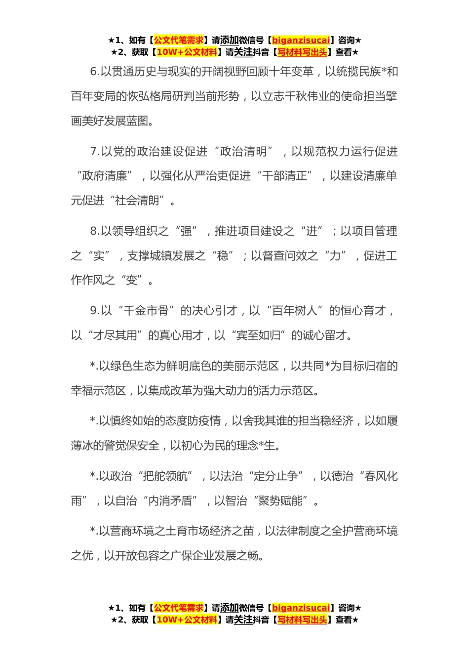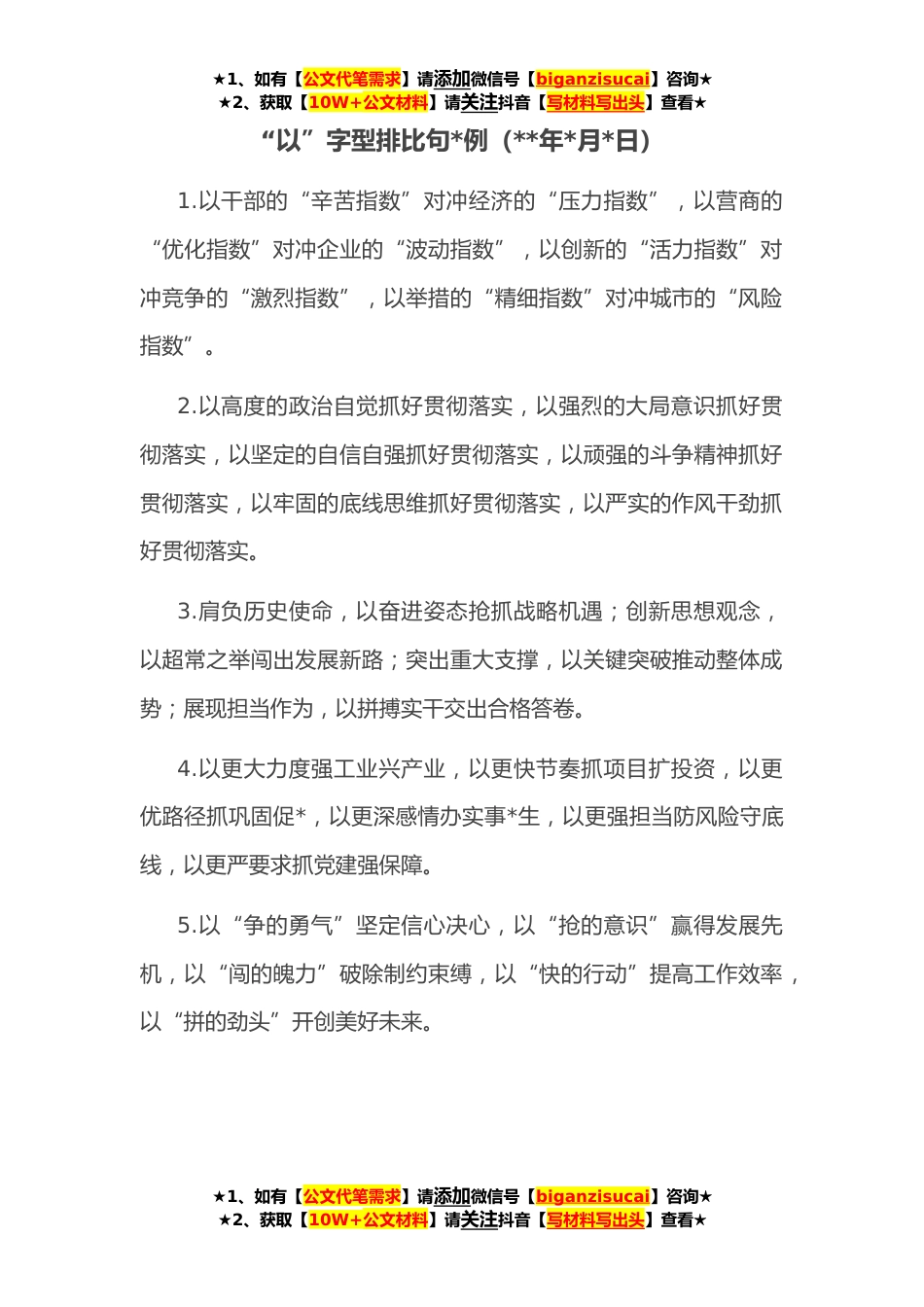 ★1、如有【公文代笔需求】请添加微信号【biganzisucai】咨询★★2、获取【10W+公文材料】请关注抖音【写材料写出头】查看★“以”字型排比句*例(**年*月*日)1.以干部的“辛苦指数”对冲经济的“压力指数”,以营商的“优化指数”对冲企业的“波动指数”,以创新的“活力指数”对冲竞争的“激烈指数”,以举措的“精细指数”对冲城市的“风险指数”。2.以高度的政治自觉抓好贯彻落实,以强烈的大局意识抓好贯彻落实,以坚定的自信自强抓好贯彻落实,以顽强的斗争精神抓好贯彻落实,以牢固的底线思维抓好贯彻落实,以严实的作风干劲抓好贯彻落实。3.肩负历史使命,以奋进姿态抢抓战略机遇;创新思想观念,以超常之举闯出发展新路;突出重大支撑,以关键突破推动整体成势;展现担当作为,以拼搏实干交出合格答卷。...