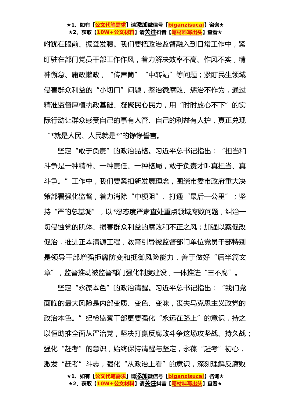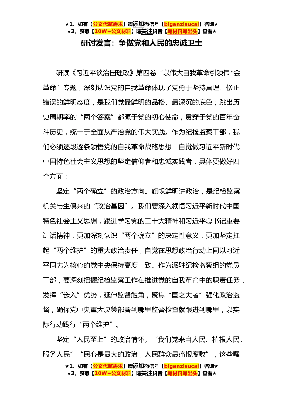★1、如有【公文代笔需求】请添加微信号【biganzisucai】咨询★★2、获取【10W+公文材料】请关注抖音【写材料写出头】查看★研讨发言:争做党和人民的忠诚卫士研读《习近平谈治国理政》第四卷“以伟大自我革命引领伟*会革命”专题,深刻认识党的自我革命体现了党勇于坚持真理、修正错误的鲜明态度,是我们党最鲜明的品格、最深沉的底色;跳出历史周期率的“两个答案”都源于党的初心使命,贯穿于党的百年奋斗历史,统一于全面从严治党的伟大实践。作为纪检监察干部,我们必须逐段逐条领悟党的自我革命战略思想,自觉做习近平新时代中国特色社会主义思想的坚定信仰者和忠诚实践者,具体要做好四个方面:坚定“两个确立”的政治方向。旗帜鲜明讲政治,是纪检监察机关与生俱来的“政治基因”。我们要深入领悟习近平新...
