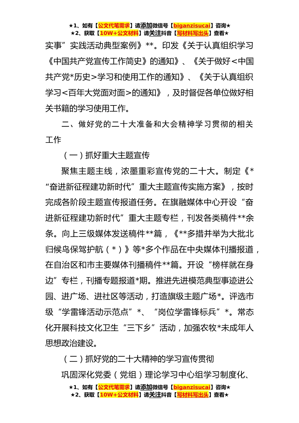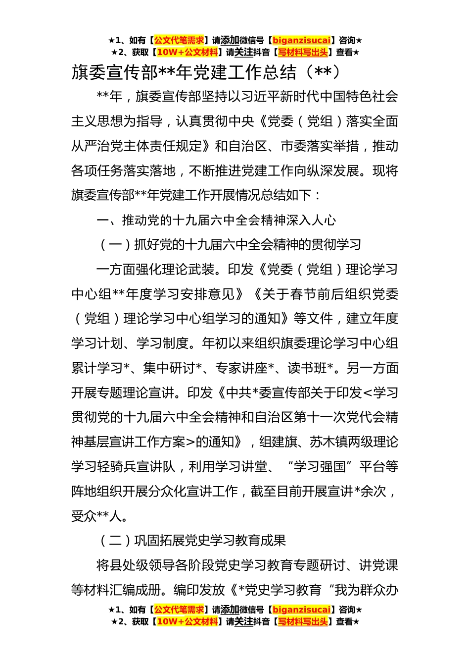 ★1、如有【公文代笔需求】请添加微信号【biganzisucai】咨询★★2、获取【10W+公文材料】请关注抖音【写材料写出头】查看★旗委宣传部**年党建工作总结(**)**年,旗委宣传部坚持以习近平新时代中国特色社会主义思想为指导,认真贯彻中央《党委(党组)落实全面从严治党主体责任规定》和自治区、市委落实举措,推动各项任务落实落地,不断推进党建工作向纵深发展。现将旗委宣传部**年党建工作开展情况总结如下:一、推动党的十九届六中全会精神深入人心(一)抓好党的十九届六中全会精神的贯彻学习一方面强化理论武装。印发《党委(党组)理论学习中心组**年度学习安排意见》《关于春节前后组织党委(党组)理论学习中心组学习的通知》等文件,建立年度学习计划、学习制度。年初以来组织旗委理论学习中心组累计...