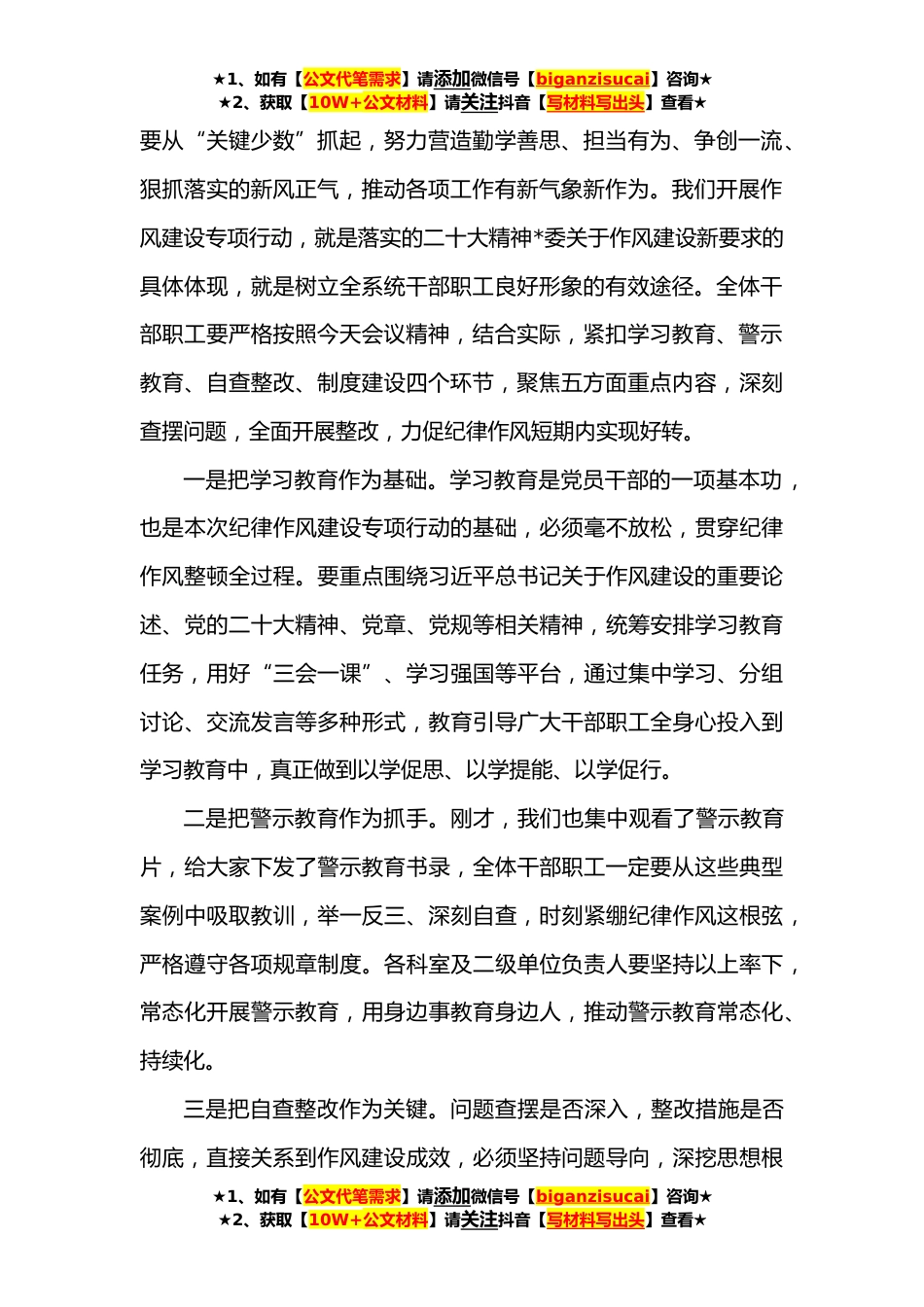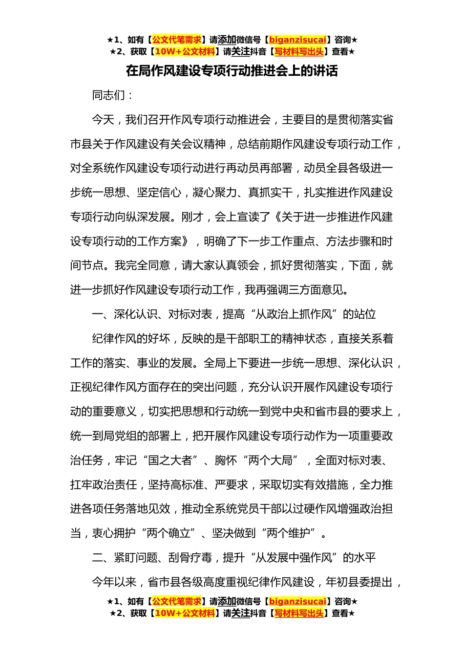 ★1、如有【公文代笔需求】请添加微信号【biganzisucai】咨询★★2、获取【10W+公文材料】请关注抖音【写材料写出头】查看★在局作风建设专项行动推进会上的讲话同志们:今天,我们召开作风专项行动推进会,主要目的是贯彻落实省市县关于作风建设有关会议精神,总结前期作风建设专项行动工作,对全系统作风建设专项行动进行再动员再部署,动员全县各级进一步统一思想、坚定信心,凝心聚力、真抓实干,扎实推进作风建设专项行动向纵深发展。刚才,会上宣读了《关于进一步推进作风建设专项行动的工作方案》,明确了下一步工作重点、方法步骤和时间节点。我完全同意,请大家认真领会,抓好贯彻落实,下面,就进一步抓好作风建设专项行动工作,我再强调三方面意见。一、深化认识、对标对表,提高“从政治上抓作风”的...
