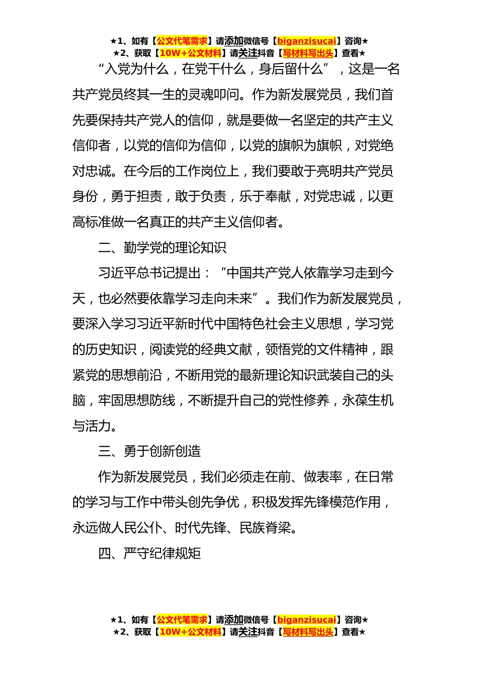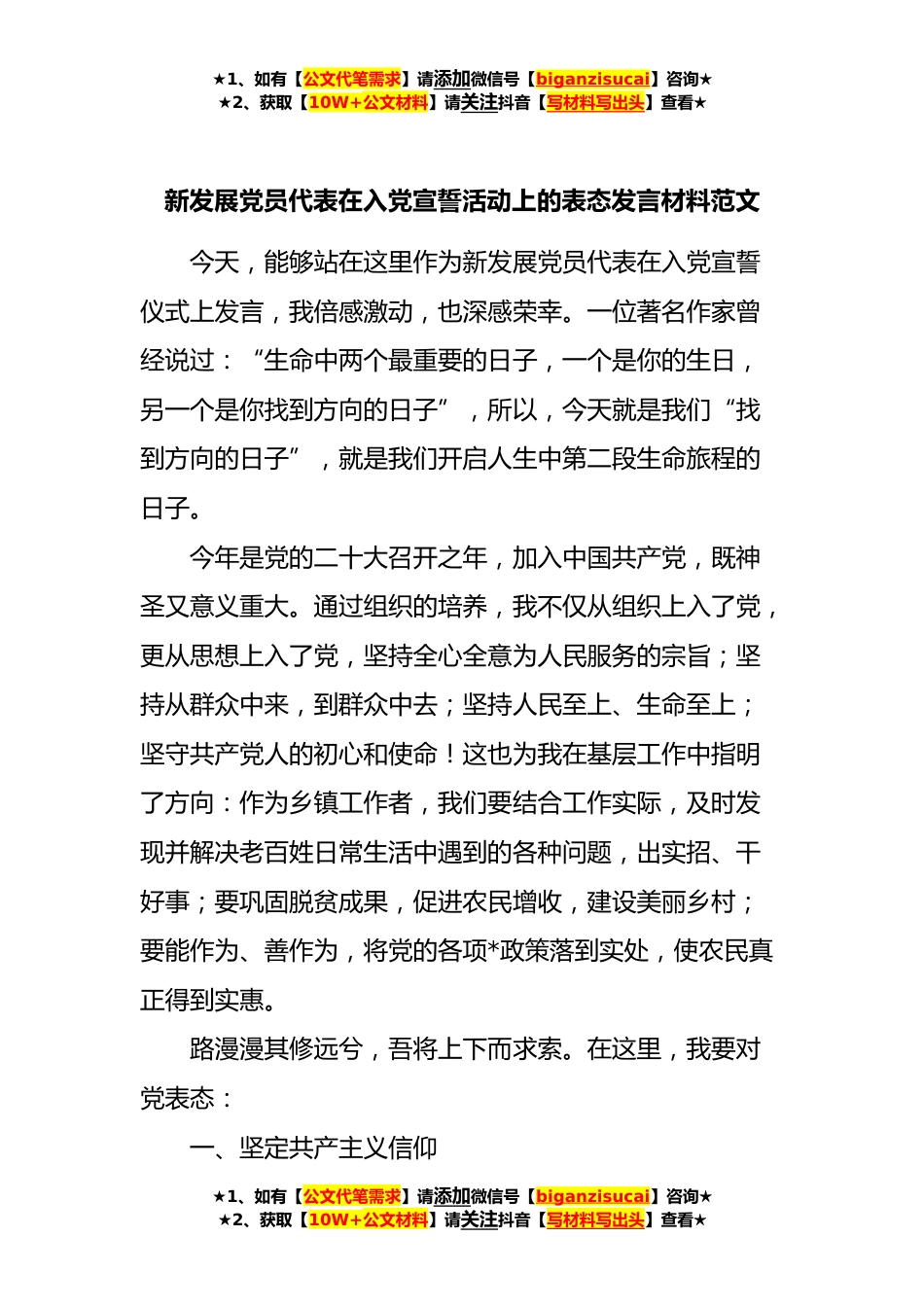 ★1、如有【公文代笔需求】请添加微信号【biganzisucai】咨询★★2、获取【10W+公文材料】请关注抖音【写材料写出头】查看★新发展党员代表在入党宣誓活动上的表态发言材料范文今天,能够站在这里作为新发展党员代表在入党宣誓仪式上发言,我倍感激动,也深感荣幸。一位著名作家曾经说过:“生命中两个最重要的日子,一个是你的生日,另一个是你找到方向的日子”,所以,今天就是我们“找到方向的日子”,就是我们开启人生中第二段生命旅程的日子。今年是党的二十大召开之年,加入中国共产党,既神圣又意义重大。通过组织的培养,我不仅从组织上入了党,更从思想上入了党,坚持全心全意为人民服务的宗旨;坚持从群众中来,到群众中去;坚持人民至上、生命至上;坚守共产党人的初心和使命!这也为我在基层工作中指...