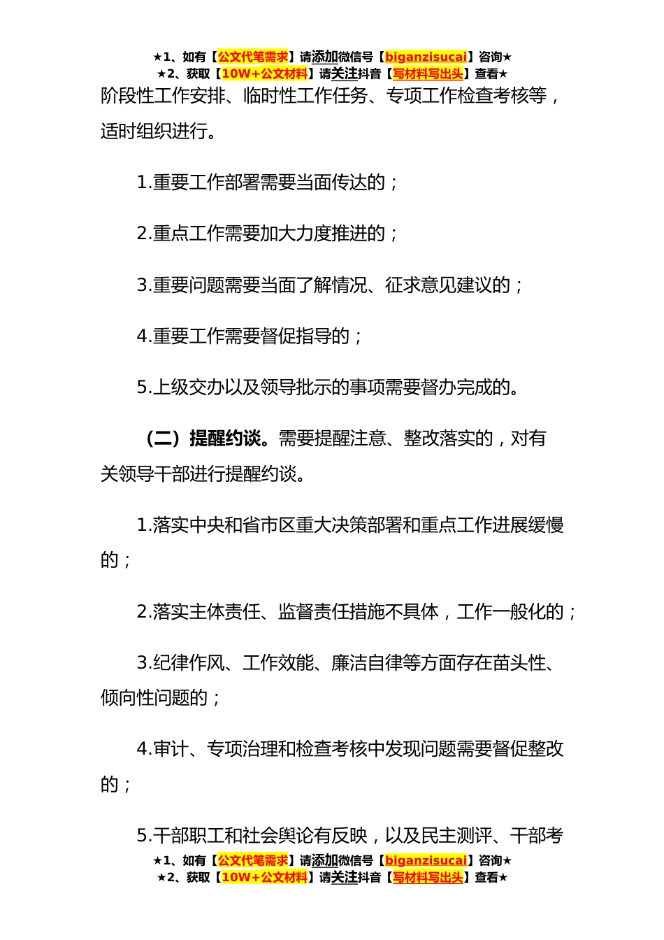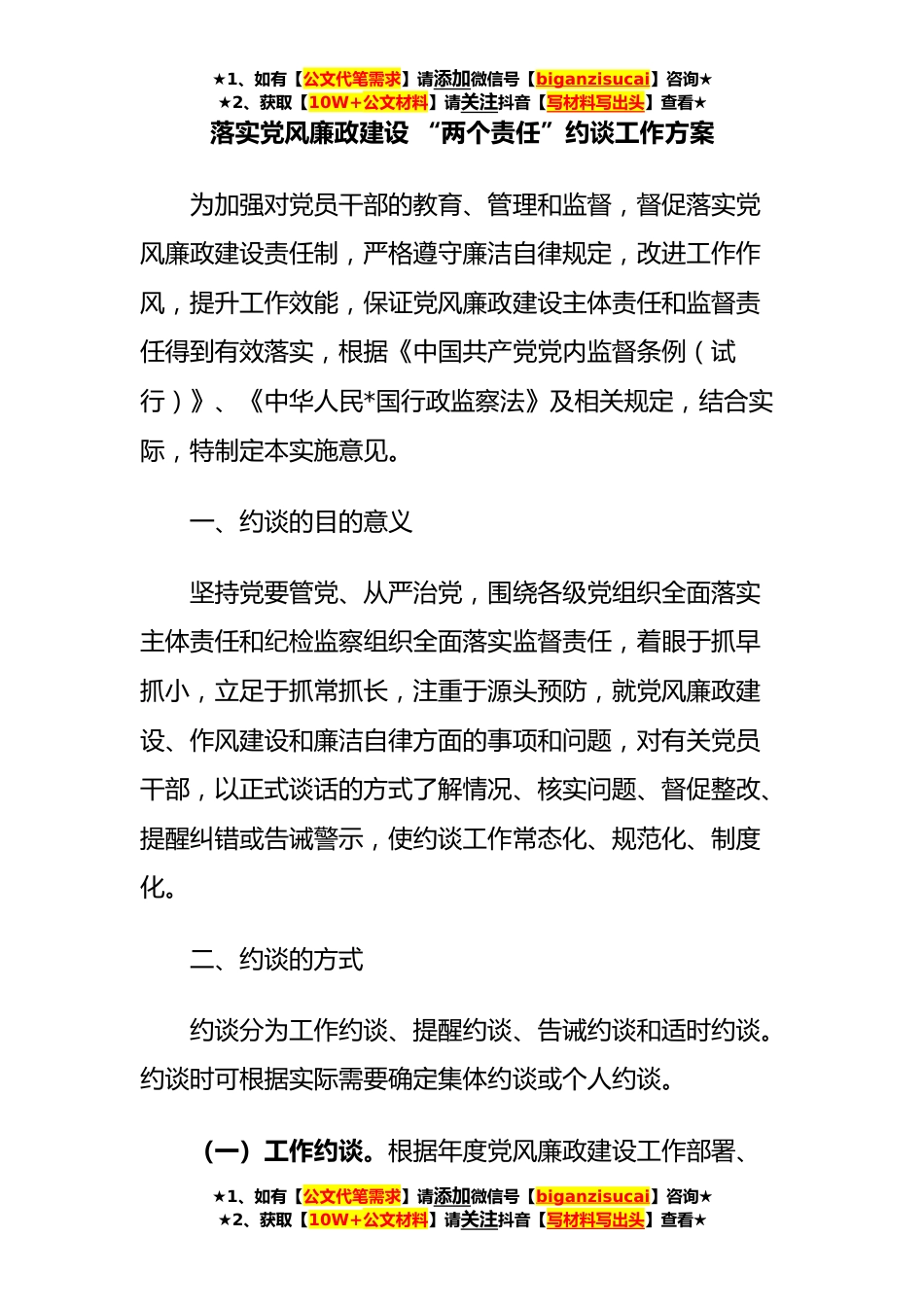 ★1、如有【公文代笔需求】请添加微信号【biganzisucai】咨询★★2、获取【10W+公文材料】请关注抖音【写材料写出头】查看★落实党风廉政建设“两个责任”约谈工作方案为加强对党员干部的教育、管理和监督,督促落实党风廉政建设责任制,严格遵守廉洁自律规定,改进工作作风,提升工作效能,保证党风廉政建设主体责任和监督责任得到有效落实,根据《中国共产党党内监督条例(试行)》、《中华人民*国行政监察法》及相关规定,结合实际,特制定本实施意见。一、约谈的目的意义坚持党要管党、从严治党,围绕各级党组织全面落实主体责任和纪检监察组织全面落实监督责任,着眼于抓早抓小,立足于抓常抓长,注重于源头预防,就党风廉政建设、作风建设和廉洁自律方面的事项和问题,对有关党员干部,以正式谈话的方式了解...
