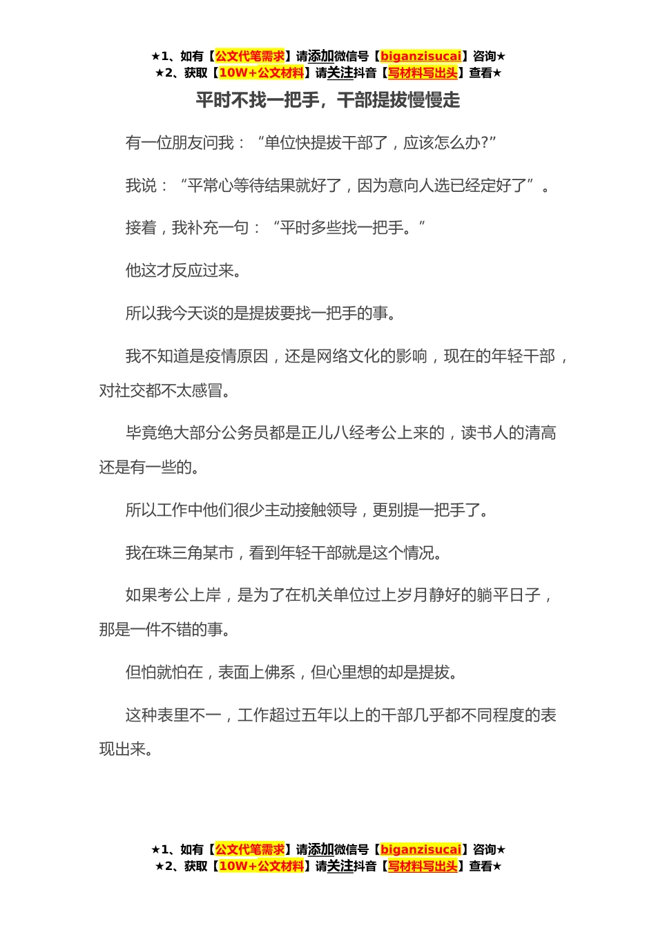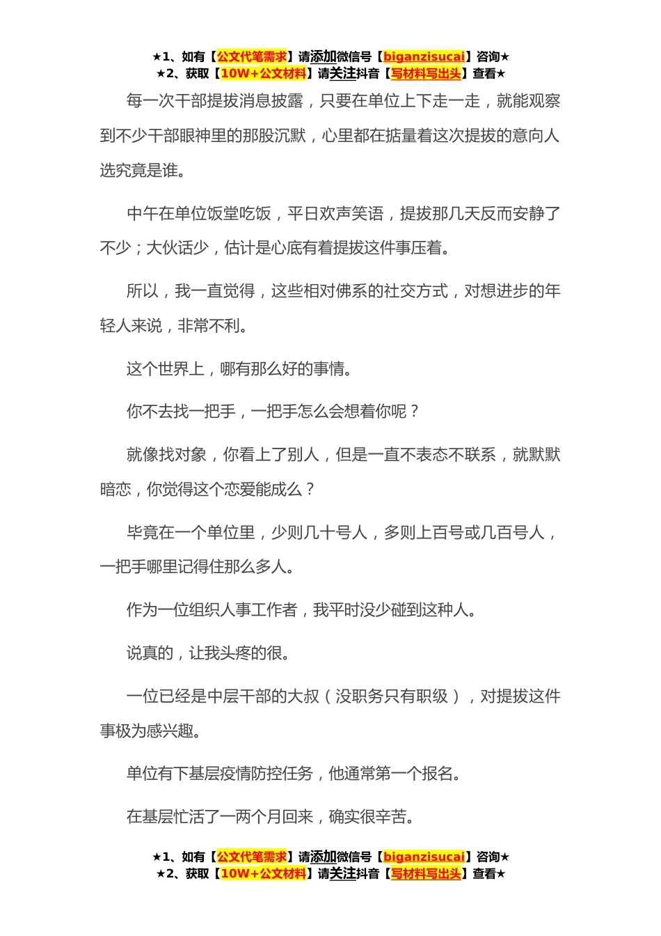 ★1、如有【公文代笔需求】请添加微信号【biganzisucai】咨询★★2、获取【10W+公文材料】请关注抖音【写材料写出头】查看★平时不找一把手,干部提拔慢慢走有一位朋友问我:“单位快提拔干部了,应该怎么办?”我说:“平常心等待结果就好了,因为意向人选已经定好了”。接着,我补充一句:“平时多些找一把手。”他这才反应过来。所以我今天谈的是提拔要找一把手的事。我不知道是疫情原因,还是网络文化的影响,现在的年轻干部,对社交都不太感冒。毕竟绝大部分公务员都是正儿八经考公上来的,读书人的清高还是有一些的。所以工作中他们很少主动接触领导,更别提一把手了。我在珠三角某市,看到年轻干部就是这个情况。如果考公上岸,是为了在机关单位过上岁月静好的躺平日子,那是一件不错的事。但怕就怕在,表面...