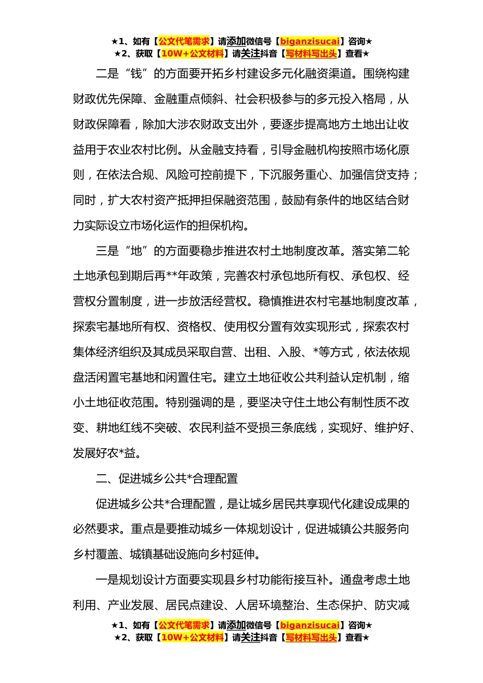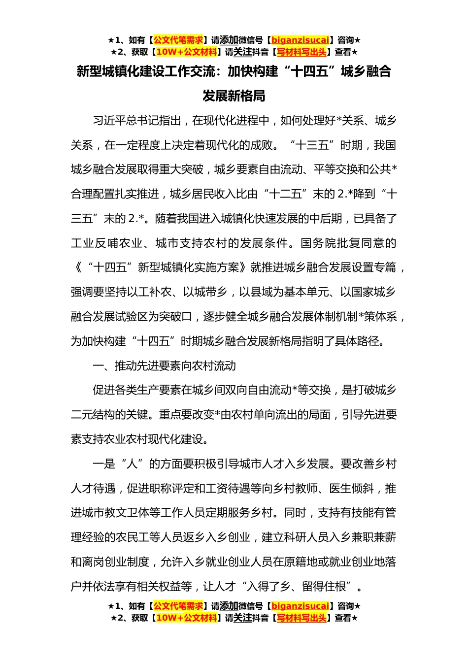 ★1、如有【公文代笔需求】请添加微信号【biganzisucai】咨询★★2、获取【10W+公文材料】请关注抖音【写材料写出头】查看★新型城镇化建设工作交流:加快构建“十四五”城乡融合发展新格局习近平总书记指出,在现代化进程中,如何处理好*关系、城乡关系,在一定程度上决定着现代化的成败。“十三五”时期,我国城乡融合发展取得重大突破,城乡要素自由流动、平等交换和公共*合理配置扎实推进,城乡居民收入比由“十二五”末的2.*降到“十三五”末的2.*。随着我国进入城镇化快速发展的中后期,已具备了工业反哺农业、城市支持农村的发展条件。国务院批复同意的《“十四五”新型城镇化实施方案》就推进城乡融合发展设置专篇,强调要坚持以工补农、以城带乡,以县域为基本单元、以国家城乡融合发展试验区为突破口,...
