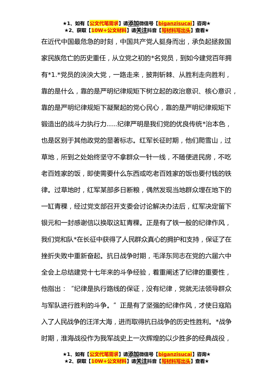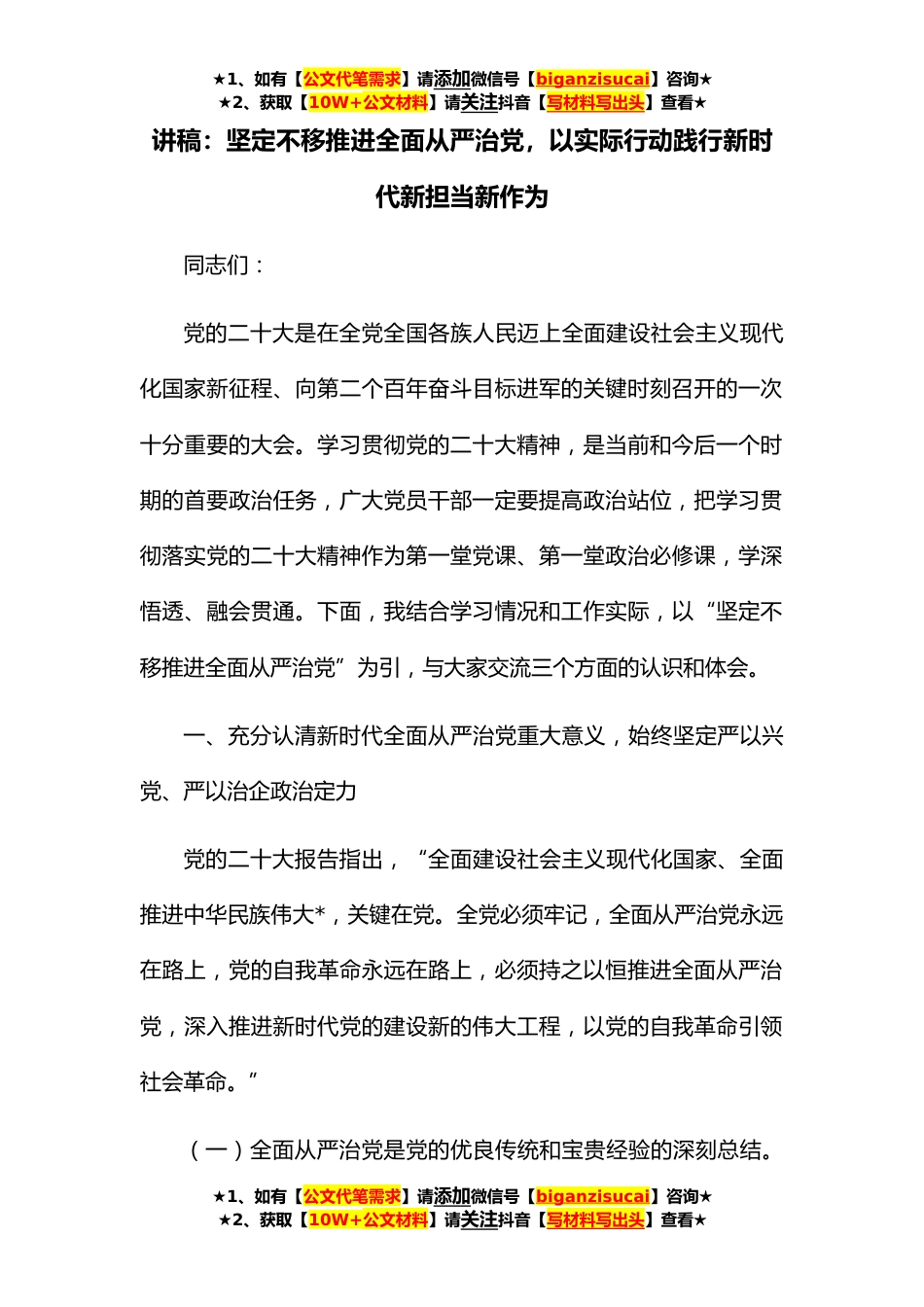 ★1、如有【公文代笔需求】请添加微信号【biganzisucai】咨询★★2、获取【10W+公文材料】请关注抖音【写材料写出头】查看★讲稿:坚定不移推进全面从严治党,以实际行动践行新时代新担当新作为同志们:党的二十大是在全党全国各族人民迈上全面建设社会主义现代化国家新征程、向第二个百年奋斗目标进军的关键时刻召开的一次十分重要的大会。学习贯彻党的二十大精神,是当前和今后一个时期的首要政治任务,广大党员干部一定要提高政治站位,把学习贯彻落实党的二十大精神作为第一堂党课、第一堂政治必修课,学深悟透、融会贯通。下面,我结合学习情况和工作实际,以“坚定不移推进全面从严治党”为引,与大家交流三个方面的认识和体会。一、充分认清新时代全面从严治党重大意义,始终坚定严以兴党、严以治企政治定...