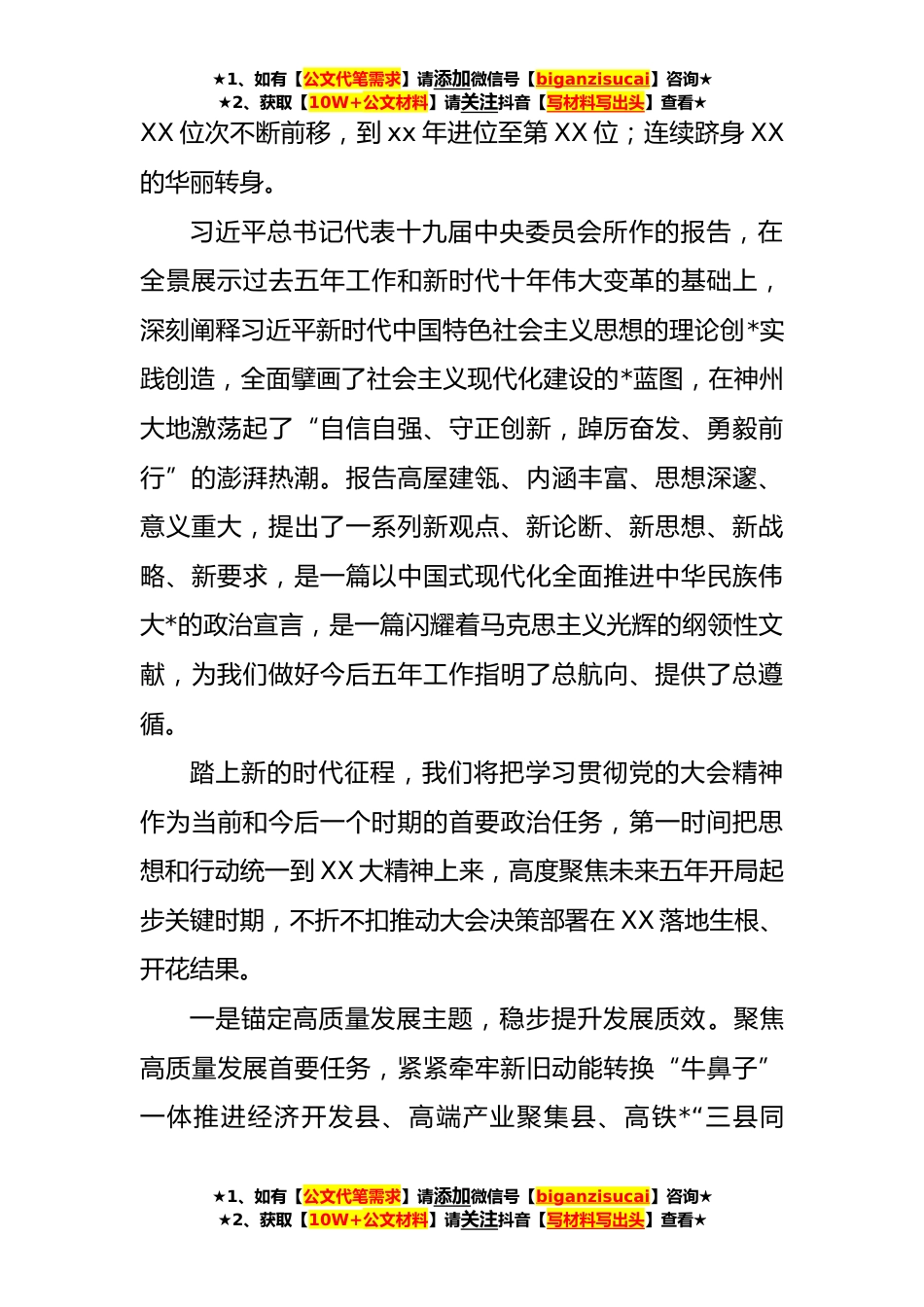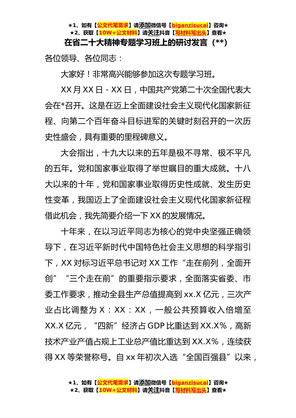 ★1、如有【公文代笔需求】请添加微信号【biganzisucai】咨询★★2、获取【10W+公文材料】请关注抖音【写材料写出头】查看★在省二十大精神专题学习班上的研讨发言(**)各位领导、各位同志:大家好!非常高兴能够参加这次专题学习班。XX月XX日-XX日,中国共产党第二十次全国代表大会在*召开。这是在迈上全面建设社会主义现代化国家新征程、向第二个百年奋斗目标进军的关键时刻召开的一次历史性盛会,具有重要的里程碑意义。大会指出,十九大以来的五年是极不寻常、极不平凡的五年。党和国家事业取得了举世瞩目的重大成就。十八大以来的十年,党和国家事业取得历史性成就、发生历史性变革,我国迈上了全面建设社会主义现代化国家新征程借此机会,我先简要介绍一下XX的发展情况。十年来,在以习近平同志为核心的党...