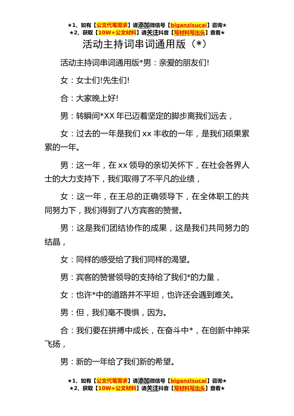 ★1、如有【公文代笔需求】请添加微信号【biganzisucai】咨询★★2、获取【10W+公文材料】请关注抖音【写材料写出头】查看★★1、如有【公文代笔需求】请添加微信号【biganzisucai】咨询★★2、获取【10W+公文材料】请关注抖音【写材料写出头】查看★★1、如有【公文代笔需求】请添加微信号【biganzisucai】咨询★★2、获取【10W+公文材料】请关注抖音【写材料写出头】查看★活动主持词串词通用版(*)活动主持词串词通用版*男:亲爱的朋友们!女:女士们!先生们!合:大家晚上好!男:转瞬间*XX年已迈着坚定的脚步离我们远去,女:过去的一年是我们xx丰收的一年,是我们硕果累累的一年。男:这一年,在xx领导的亲切关怀下,在社会各界人士的大力支持下,我们取得了不平凡的业绩,女:这一年,在王总的正确领导下,在...