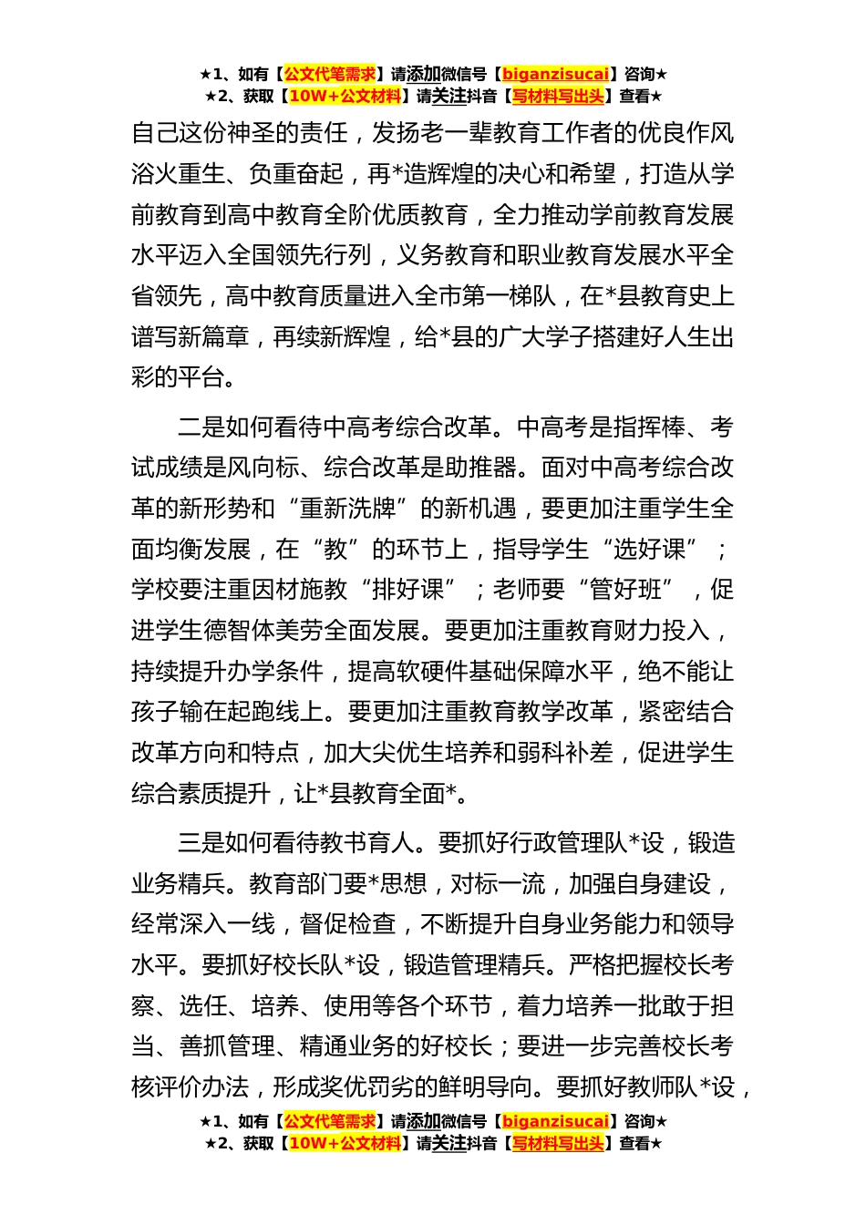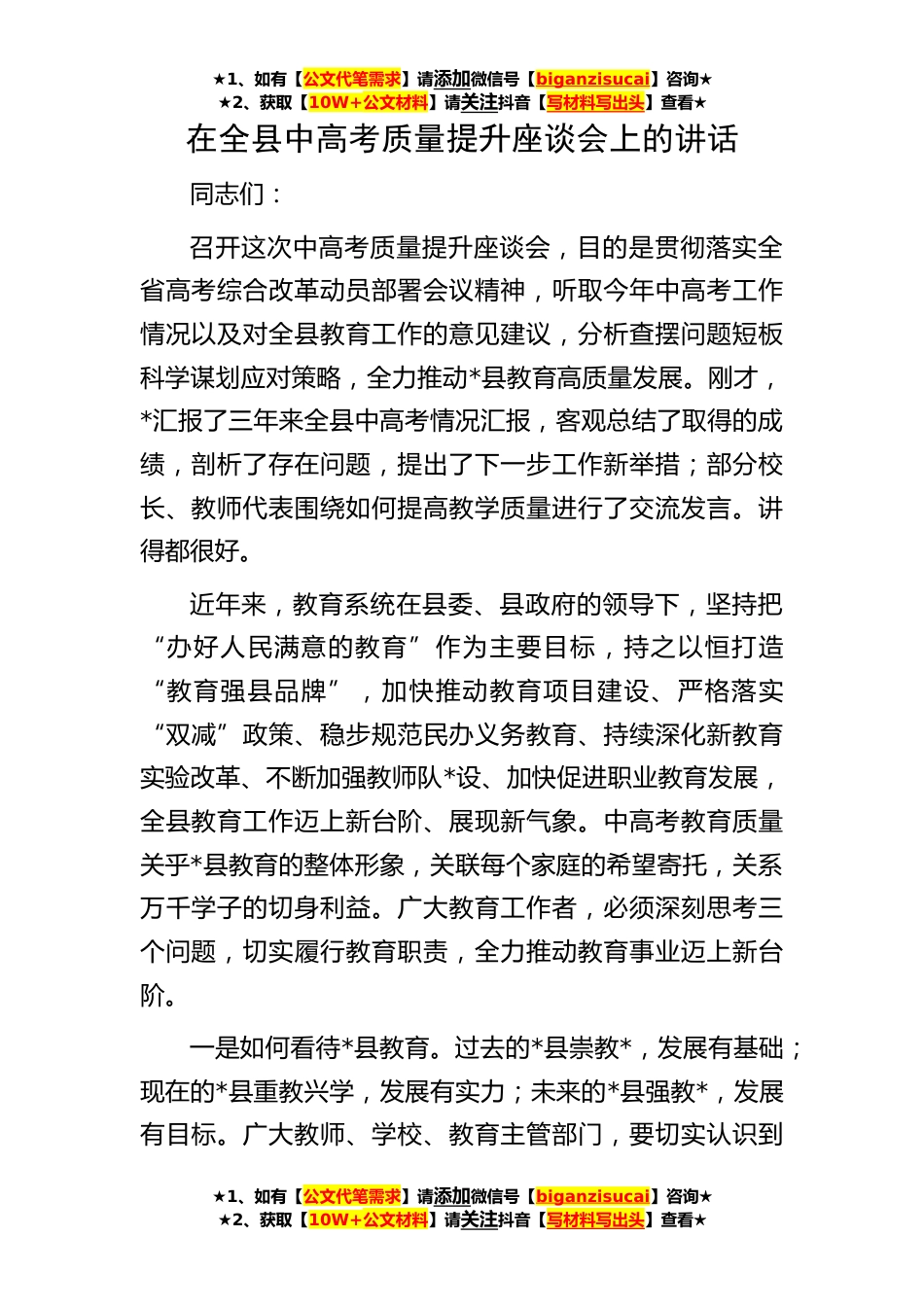 ★1、如有【公文代笔需求】请添加微信号【biganzisucai】咨询★★2、获取【10W+公文材料】请关注抖音【写材料写出头】查看★在全县中高考质量提升座谈会上的讲话同志们:召开这次中高考质量提升座谈会,目的是贯彻落实全省高考综合改革动员部署会议精神,听取今年中高考工作情况以及对全县教育工作的意见建议,分析查摆问题短板科学谋划应对策略,全力推动*县教育高质量发展。刚才,*汇报了三年来全县中高考情况汇报,客观总结了取得的成绩,剖析了存在问题,提出了下一步工作新举措;部分校长、教师代表围绕如何提高教学质量进行了交流发言。讲得都很好。近年来,教育系统在县委、县政府的领导下,坚持把“办好人民满意的教育”作为主要目标,持之以恒打造“教育强县品牌”,加快推动教育项目建设、严格落实“双...