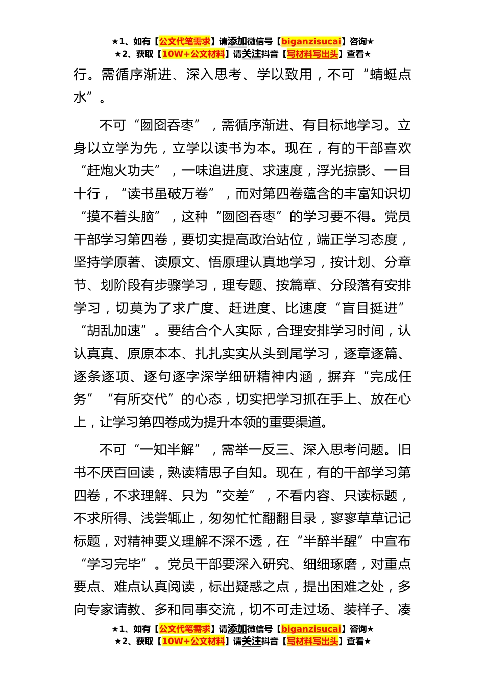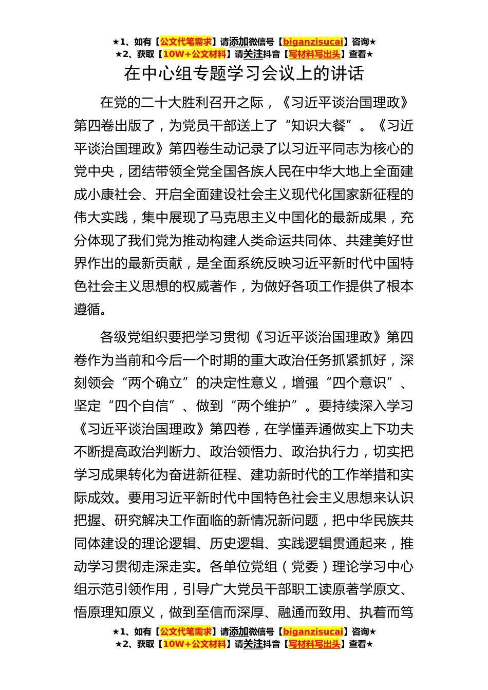 ★1、如有【公文代笔需求】请添加微信号【biganzisucai】咨询★★2、获取【10W+公文材料】请关注抖音【写材料写出头】查看★在中心组专题学习会议上的讲话在党的二十大胜利召开之际,《习近平谈治国理政》第四卷出版了,为党员干部送上了“知识大餐”。《习近平谈治国理政》第四卷生动记录了以习近平同志为核心的党中央,团结带领全党全国各族人民在中华大地上全面建成小康社会、开启全面建设社会主义现代化国家新征程的伟大实践,集中展现了马克思主义中国化的最新成果,充分体现了我们党为推动构建人类命运共同体、共建美好世界作出的最新贡献,是全面系统反映习近平新时代中国特色社会主义思想的权威著作,为做好各项工作提供了根本遵循。各级党组织要把学习贯彻《习近平谈治国理政》第四卷作为当前和今后一个...