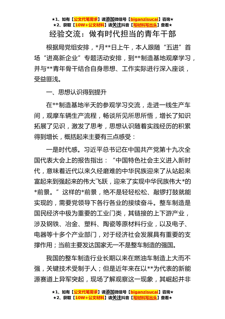 ★1、如有【公文代笔需求】请添加微信号【biganzisucai】咨询★★2、获取【10W+公文材料】请关注抖音【写材料写出头】查看★★1、如有【公文代笔需求】请添加微信号【biganzisucai】咨询★★2、获取【10W+公文材料】请关注抖音【写材料写出头】查看★★1、如有【公文代笔需求】请添加微信号【biganzisucai】咨询★★2、获取【10W+公文材料】请关注抖音【写材料写出头】查看★经验交流:做有时代担当的青年干部根据局党组安排,*月**日上午,本人跟随“五进”首场“进高新企业”专题活动安排,到**制造基地观摩学习,并与**青年骨干结合自身思想、工作实际进行深入座谈,受益匪浅。一、思想认识得到提升在**制造基地半天的参观学习交流,走进一线生产车间,观摩车辆生产流程,畅谈所见所思所悟,增长了知识拓展了见...