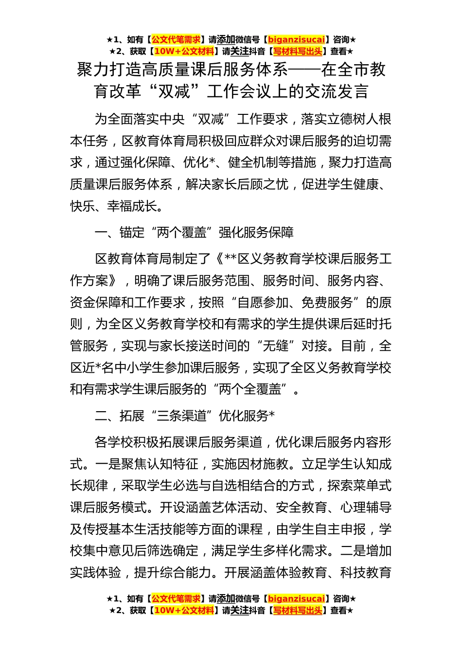 ★1、如有【公文代笔需求】请添加微信号【biganzisucai】咨询★★2、获取【10W+公文材料】请关注抖音【写材料写出头】查看★★1、如有【公文代笔需求】请添加微信号【biganzisucai】咨询★★2、获取【10W+公文材料】请关注抖音【写材料写出头】查看★★1、如有【公文代笔需求】请添加微信号【biganzisucai】咨询★★2、获取【10W+公文材料】请关注抖音【写材料写出头】查看★聚力打造高质量课后服务体系——在全市教育改革“双减”工作会议上的交流发言为全面落实中央“双减”工作要求,落实立德树人根本任务,区教育体育局积极回应群众对课后服务的迫切需求,通过强化保障、优化*、健全机制等措施,聚力打造高质量课后服务体系,解决家长后顾之忧,促进学生健康、快乐、幸福成长。一、锚定“两个覆盖”强化服务保...