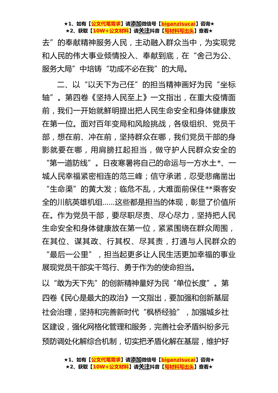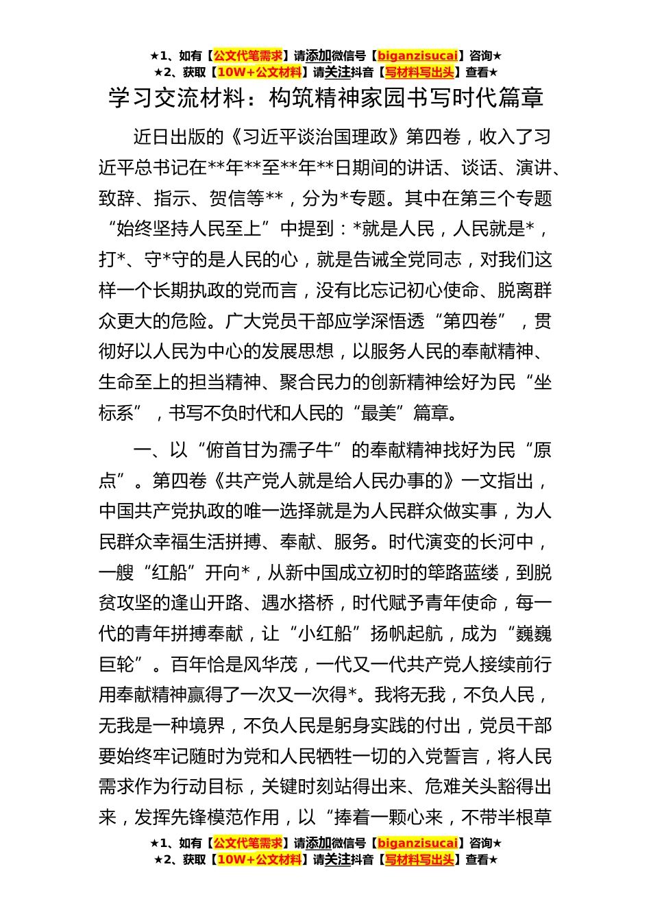 ★1、如有【公文代笔需求】请添加微信号【biganzisucai】咨询★★2、获取【10W+公文材料】请关注抖音【写材料写出头】查看★学习交流材料:构筑精神家园书写时代篇章近日出版的《习近平谈治国理政》第四卷,收入了习近平总书记在**年**至**年**日期间的讲话、谈话、演讲、致辞、指示、贺信等**,分为*专题。其中在第三个专题“始终坚持人民至上”中提到:*就是人民,人民就是*,打*、守*守的是人民的心,就是告诫全党同志,对我们这样一个长期执政的党而言,没有比忘记初心使命、脱离群众更大的危险。广大党员干部应学深悟透“第四卷”,贯彻好以人民为中心的发展思想,以服务人民的奉献精神、生命至上的担当精神、聚合民力的创新精神绘好为民“坐标系”,书写不负时代和人民的“最美”篇章。一、以“俯首甘为孺子...