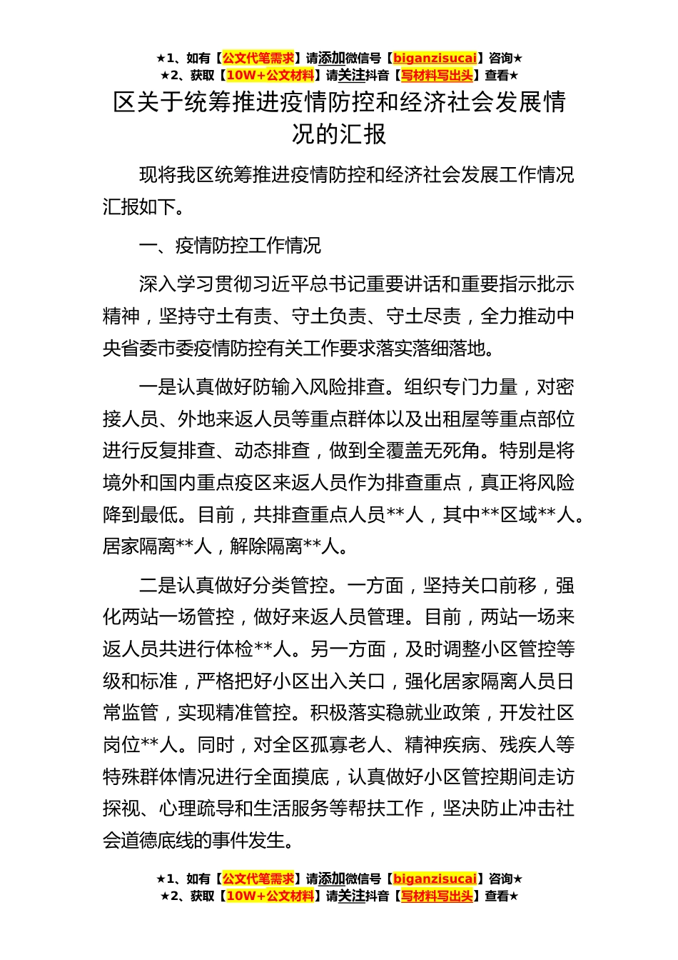★1、如有【公文代笔需求】请添加微信号【biganzisucai】咨询★★2、获取【10W+公文材料】请关注抖音【写材料写出头】查看★★1、如有【公文代笔需求】请添加微信号【biganzisucai】咨询★★2、获取【10W+公文材料】请关注抖音【写材料写出头】查看★★1、如有【公文代笔需求】请添加微信号【biganzisucai】咨询★★2、获取【10W+公文材料】请关注抖音【写材料写出头】查看★区关于统筹推进疫情防控和经济社会发展情况的汇报现将我区统筹推进疫情防控和经济社会发展工作情况汇报如下。一、疫情防控工作情况深入学习贯彻习近平总书记重要讲话和重要指示批示精神,坚持守土有责、守土负责、守土尽责,全力推动中央省委市委疫情防控有关工作要求落实落细落地。一是认真做好防输入风险排查。组织专门力量,对密接人员...