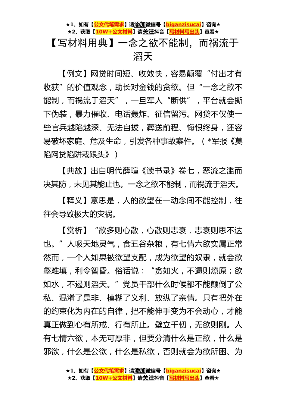 ★1、如有【公文代笔需求】请添加微信号【biganzisucai】咨询★★2、获取【10W+公文材料】请关注抖音【写材料写出头】查看★★1、如有【公文代笔需求】请添加微信号【biganzisucai】咨询★★2、获取【10W+公文材料】请关注抖音【写材料写出头】查看★★1、如有【公文代笔需求】请添加微信号【biganzisucai】咨询★★2、获取【10W+公文材料】请关注抖音【写材料写出头】查看★【写材料用典】一念之欲不能制,而祸流于滔天【例文】网贷时间短、收效快,容易颠覆“付出才有收获”的价值观念,助长对金钱的贪欲。但“一念之欲不能制,而祸流于滔天”,一旦军人“断供”,平台就会撕下伪装,暴力催收、电话轰炸、征信留污。网贷不仅使一些官兵越陷越深、无法自拔,葬送前程、悔恨终身,还容易破坏家庭、危及生命,引发...