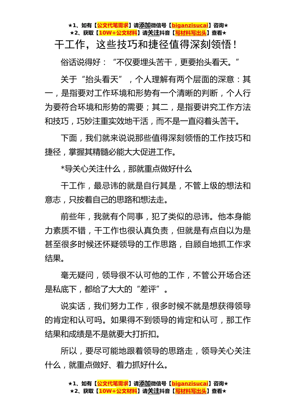 ★1、如有【公文代笔需求】请添加微信号【biganzisucai】咨询★★2、获取【10W+公文材料】请关注抖音【写材料写出头】查看★★1、如有【公文代笔需求】请添加微信号【biganzisucai】咨询★★2、获取【10W+公文材料】请关注抖音【写材料写出头】查看★★1、如有【公文代笔需求】请添加微信号【biganzisucai】咨询★★2、获取【10W+公文材料】请关注抖音【写材料写出头】查看★干工作,这些技巧和捷径值得深刻领悟!俗话说得好:“不仅要埋头苦干,更要抬头看天。”关于“抬头看天”,个人理解有两个层面的深意:其一,是指要对工作环境和形势有一个清晰的判断,个人行为要符合环境和形势的需要;其二,是指要讲究工作方法和技巧,巧妙注重实效地干活,而不是一直闷着头苦干。下面,我们就来说说那些值得深刻领悟的...
