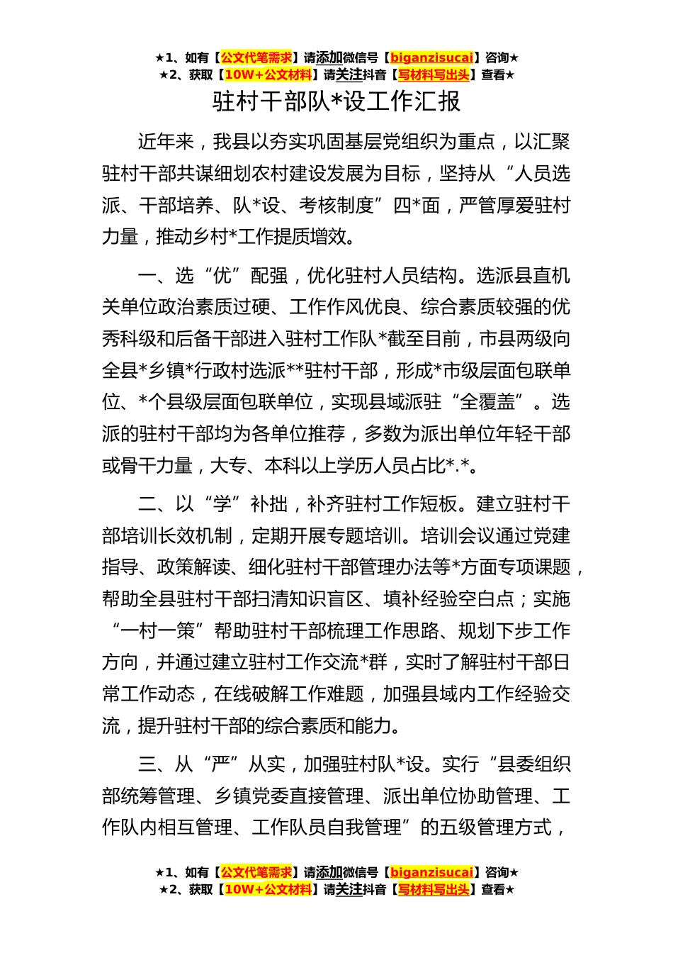 ★1、如有【公文代笔需求】请添加微信号【biganzisucai】咨询★★2、获取【10W+公文材料】请关注抖音【写材料写出头】查看★★1、如有【公文代笔需求】请添加微信号【biganzisucai】咨询★★2、获取【10W+公文材料】请关注抖音【写材料写出头】查看★★1、如有【公文代笔需求】请添加微信号【biganzisucai】咨询★★2、获取【10W+公文材料】请关注抖音【写材料写出头】查看★驻村干部队*设工作汇报近年来,我县以夯实巩固基层党组织为重点,以汇聚驻村干部共谋细划农村建设发展为目标,坚持从“人员选派、干部培养、队*设、考核制度”四*面,严管厚爱驻村力量,推动乡村*工作提质增效。一、选“优”配强,优化驻村人员结构。选派县直机关单位政治素质过硬、工作作风优良、综合素质较强的优秀科级和后备干部进入驻...