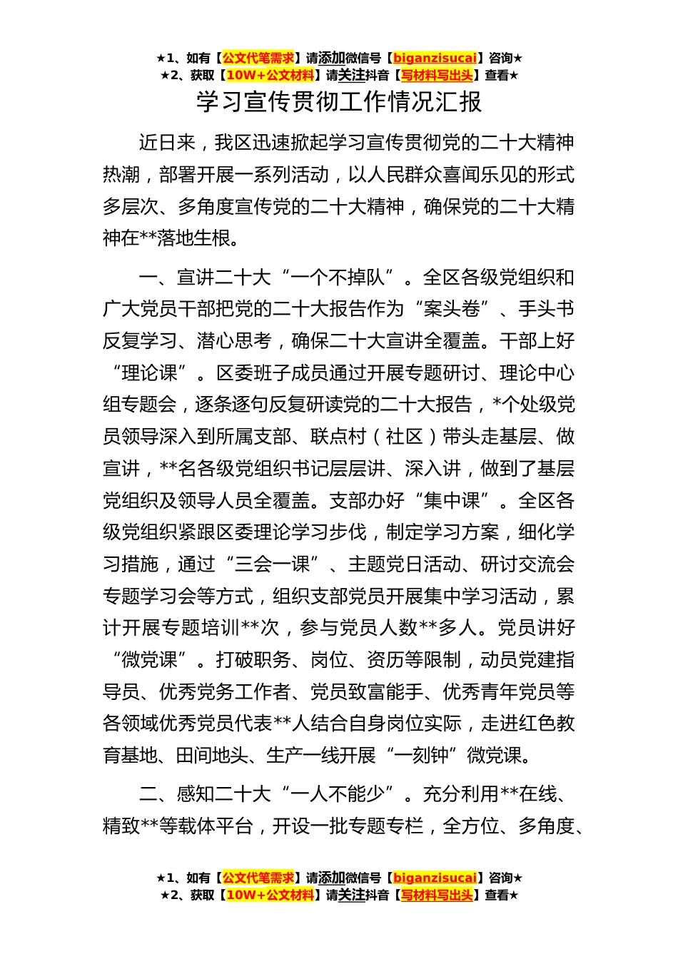 ★1、如有【公文代笔需求】请添加微信号【biganzisucai】咨询★★2、获取【10W+公文材料】请关注抖音【写材料写出头】查看★★1、如有【公文代笔需求】请添加微信号【biganzisucai】咨询★★2、获取【10W+公文材料】请关注抖音【写材料写出头】查看★★1、如有【公文代笔需求】请添加微信号【biganzisucai】咨询★★2、获取【10W+公文材料】请关注抖音【写材料写出头】查看★学习宣传贯彻工作情况汇报近日来,我区迅速掀起学习宣传贯彻党的二十大精神热潮,部署开展一系列活动,以人民群众喜闻乐见的形式多层次、多角度宣传党的二十大精神,确保党的二十大精神在**落地生根。一、宣讲二十大“一个不掉队”。全区各级党组织和广大党员干部把党的二十大报告作为“案头卷”、手头书反复学习、潜心思考,确保二十大宣...