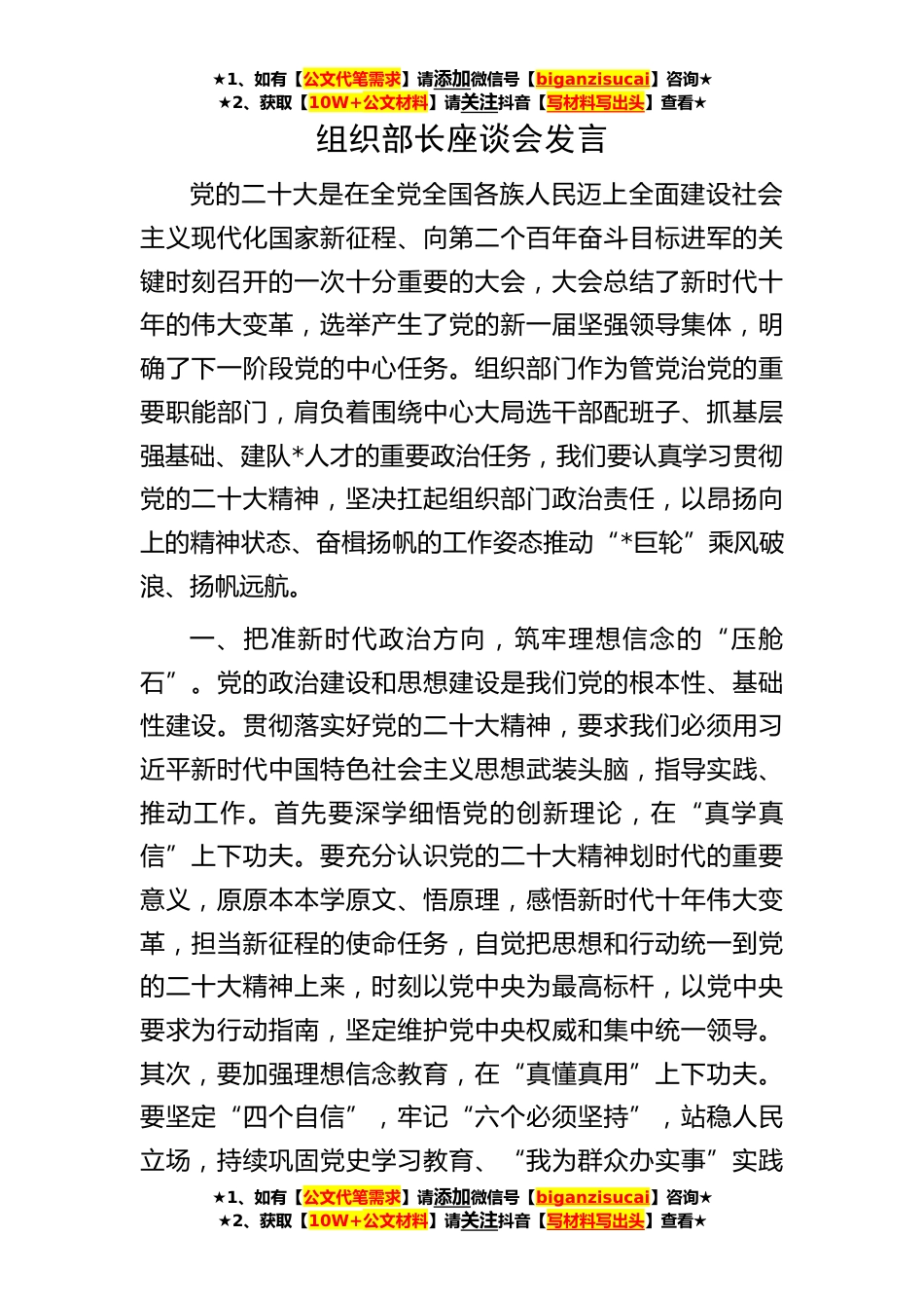 ★1、如有【公文代笔需求】请添加微信号【biganzisucai】咨询★★2、获取【10W+公文材料】请关注抖音【写材料写出头】查看★★1、如有【公文代笔需求】请添加微信号【biganzisucai】咨询★★2、获取【10W+公文材料】请关注抖音【写材料写出头】查看★★1、如有【公文代笔需求】请添加微信号【biganzisucai】咨询★★2、获取【10W+公文材料】请关注抖音【写材料写出头】查看★组织部长座谈会发言党的二十大是在全党全国各族人民迈上全面建设社会主义现代化国家新征程、向第二个百年奋斗目标进军的关键时刻召开的一次十分重要的大会,大会总结了新时代十年的伟大变革,选举产生了党的新一届坚强领导集体,明确了下一阶段党的中心任务。组织部门作为管党治党的重要职能部门,肩负着围绕中心大局选干部配班子、抓基层...