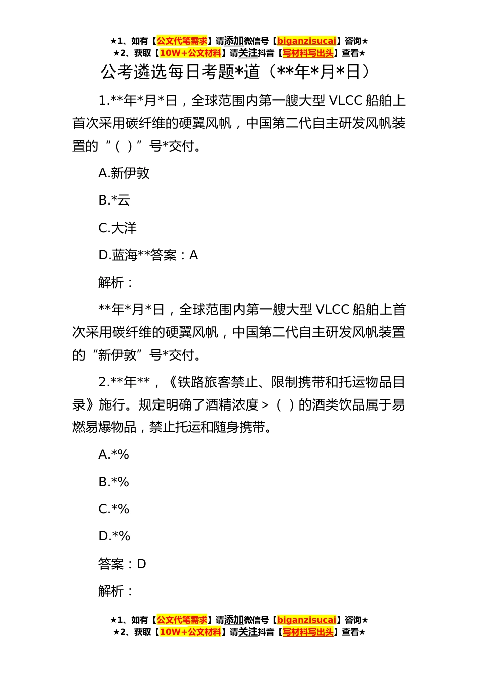 ★1、如有【公文代笔需求】请添加微信号【biganzisucai】咨询★★2、获取【10W+公文材料】请关注抖音【写材料写出头】查看★★1、如有【公文代笔需求】请添加微信号【biganzisucai】咨询★★2、获取【10W+公文材料】请关注抖音【写材料写出头】查看★★1、如有【公文代笔需求】请添加微信号【biganzisucai】咨询★★2、获取【10W+公文材料】请关注抖音【写材料写出头】查看★公考遴选每日考题*道(**年*月*日)1.**年*月*日,全球范围内第一艘大型VLCC船舶上首次采用碳纤维的硬翼风帆,中国第二代自主研发风帆装置的“()”号*交付。A.新伊敦B.*云C.大洋D.蓝海**答案:A解析:**年*月*日,全球范围内第一艘大型VLCC船舶上首次采用碳纤维的硬翼风帆,中国第二代自主研发风帆装置的“新伊敦”号*交付。2.**年**,《...