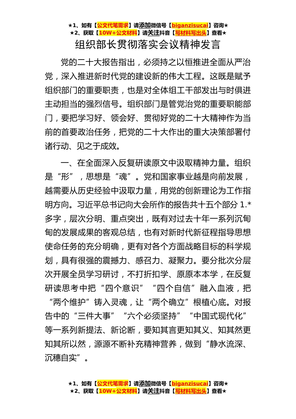 ★1、如有【公文代笔需求】请添加微信号【biganzisucai】咨询★★2、获取【10W+公文材料】请关注抖音【写材料写出头】查看★★1、如有【公文代笔需求】请添加微信号【biganzisucai】咨询★★2、获取【10W+公文材料】请关注抖音【写材料写出头】查看★★1、如有【公文代笔需求】请添加微信号【biganzisucai】咨询★★2、获取【10W+公文材料】请关注抖音【写材料写出头】查看★组织部长贯彻落实会议精神发言党的二十大报告指出,必须持之以恒推进全面从严治党,深入推进新时代党的建设新的伟大工程。这既是赋予组织部门的重要职责,也是对全体组工干部发出与时俱进主动担当的强烈信号。组织部门是管党治党的重要职能部门,要把学习好、领会好、贯彻好党的二十大精神作为当前的首要政治任务,把党的二十大作出的重大...