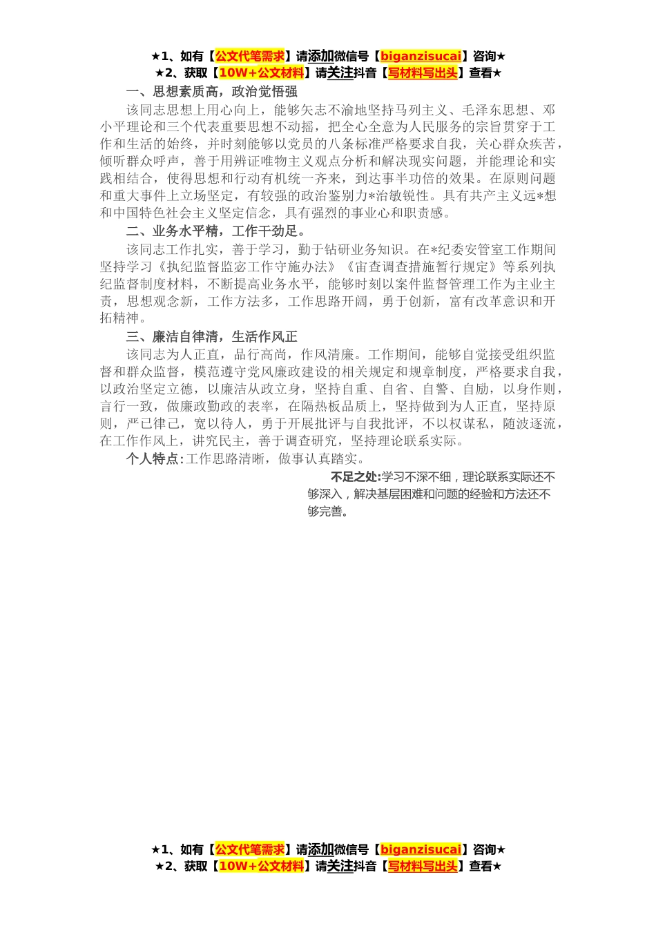 ★1、如有【公文代笔需求】请添加微信号【biganzisucai】咨询★★2、获取【10W+公文材料】请关注抖音【写材料写出头】查看★一、思想素质高,政治觉悟强该同志思想上用心向上,能够矢志不渝地坚持马列主义、毛泽东思想、邓小平理论和三个代表重要思想不动摇,把全心全意为人民服务的宗旨贯穿于工作和生活的始终,并时刻能够以党员的八条标准严格要求自我,关心群众疾苦,倾听群众呼声,善于用辨证唯物主义观点分析和解决现实问题,并能理论和实践相结合,使得思想和行动有机统一齐来,到达事半功倍的效果。在原则问题和重大事件上立场坚定,有较强的政治鉴别力*治敏锐性。具有共产主义远*想和中国特色社会主义坚定信念,具有强烈的事业心和职责感。二、业务水平精,工作干劲足。该同志工作扎实,善于学习,勤于钻...