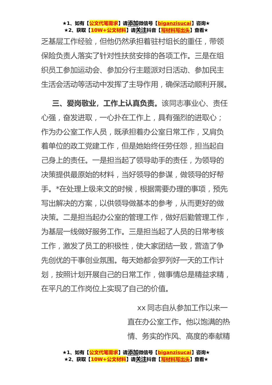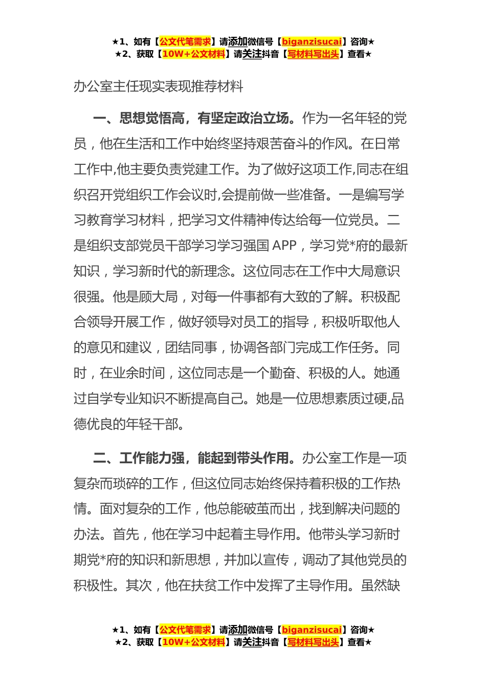★1、如有【公文代笔需求】请添加微信号【biganzisucai】咨询★★2、获取【10W+公文材料】请关注抖音【写材料写出头】查看★办公室主任现实表现推荐材料一、思想觉悟高,有坚定政治立场。作为一名年轻的党员,他在生活和工作中始终坚持艰苦奋斗的作风。在日常工作中,他主要负责党建工作。为了做好这项工作,同志在组织召开党组织工作会议时,会提前做一些准备。一是编写学习教育学习材料,把学习文件精神传达给每一位党员。二是组织支部党员干部学习学习强国APP,学习党*府的最新知识,学习新时代的新理念。这位同志在工作中大局意识很强。他是顾大局,对每一件事都有大致的了解。积极配合领导开展工作,做好领导对员工的指导,积极听取他人的意见和建议,团结同事,协调各部门完成工作任务。同时,在业余时间,这位...