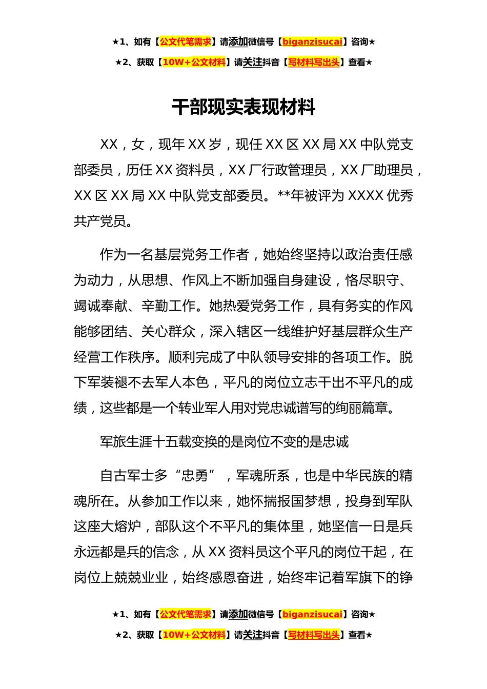 ★1、如有【公文代笔需求】请添加微信号【biganzisucai】咨询★★2、获取【10W+公文材料】请关注抖音【写材料写出头】查看★★1、如有【公文代笔需求】请添加微信号【biganzisucai】咨询★★2、获取【10W+公文材料】请关注抖音【写材料写出头】查看★★1、如有【公文代笔需求】请添加微信号【biganzisucai】咨询★★2、获取【10W+公文材料】请关注抖音【写材料写出头】查看★干部现实表现材料XX,女,现年XX岁,现任XX区XX局XX中队党支部委员,历任XX资料员,XX厂行政管理员,XX厂助理员,XX区XX局XX中队党支部委员。**年被评为XXXX优秀共产党员。作为一名基层党务工作者,她始终坚持以政治责任感为动力,从思想、作风上不断加强自身建设,恪尽职守、竭诚奉献、辛勤工作。她热爱党务工作,具有务实的作风能够团结...