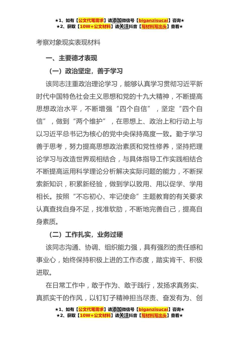 ★1、如有【公文代笔需求】请添加微信号【biganzisucai】咨询★★2、获取【10W+公文材料】请关注抖音【写材料写出头】查看★考察对象现实表现材料一、主要德才表现(一)政治坚定,善于学习该同志注重政治理论学习,能够认真学习贯彻习近平新时代中国特色社会主义思想和党的十九大精神,不断提高思想政治水平,不断增强“四个自信”,坚定“四个自信”,做到“两个维护”,在思想上、政治上和行动上与以习近平总书记为核心的党中央保持高度一致。勤于学习善于思考,努力提高思想政治素质和党性修养,坚持把理论学习与改造世界观相结合,与具体指导工作实践相结合不断提高运用科学理论分析解决实际问题的能力,不断探索新知识,积累新经验,做到学以致用、用以促学、学用相长。按照“不忘初心、牢记使命”主题教育...