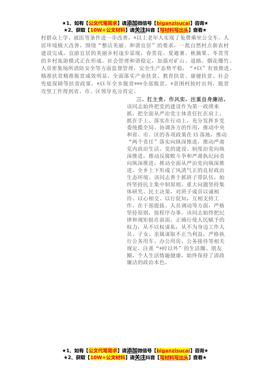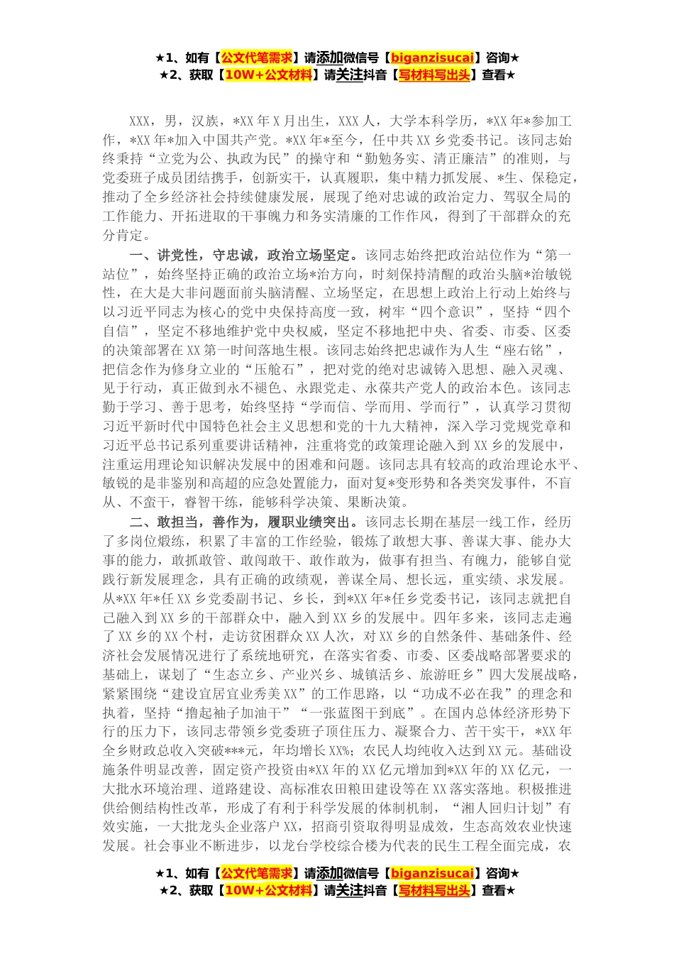 ★1、如有【公文代笔需求】请添加微信号【biganzisucai】咨询★★2、获取【10W+公文材料】请关注抖音【写材料写出头】查看★XXX,男,汉族,*XX年X月出生,XXX人,大学本科学历,*XX年*参加工作,*XX年*加入中国共产党。*XX年*至今,任中共XX乡党委书记。该同志始终秉持“立党为公、执政为民”的操守和“勤勉务实、清正廉洁”的准则,与党委班子成员团结携手,创新实干,认真履职,集中精力抓发展、*生、保稳定,推动了全乡经济社会持续健康发展,展现了绝对忠诚的政治定力、驾驭全局的工作能力、开拓进取的干事魄力和务实清廉的工作作风,得到了干部群众的充分肯定。一、讲党性,守忠诚,政治立场坚定。该同志始终把政治站位作为“第一站位”,始终坚持正确的政治立场*治方向,时刻保持清醒的政治头脑*治敏锐性,...