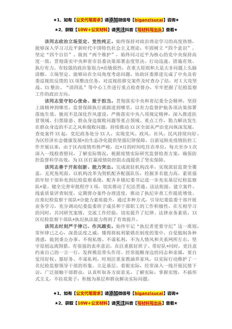 ★1、如有【公文代笔需求】请添加微信号【biganzisucai】咨询★★2、获取【10W+公文材料】请关注抖音【写材料写出头】查看★该同志政治立场坚定、党性纯正。始终保持对政治理论学习的高度热情,能够深入学习习近平新时代中国特色社会主义理论,牢固树立“四个意识”、坚定“四个自信”、做到“两个维护”,始终同习近平为核心的党中央保持高度一致,贯彻落实中央和省市县委决策部署态度坚决、行动迅速、措施有效、执行有力。有较强的政治鉴别力*治敏锐性,在重大原则和大是大非问题上头脑清醒、立场坚定。能够站在全局角度考虑问题,协助区委推进完成了中央及省委巡视组反馈的XX项整改任务,对巡视组移交案件及时查办了结,对X大攻坚战、XX整治、“清四乱”等中心工作进行重点检查督办,牢牢把握了纪检监察工作的...