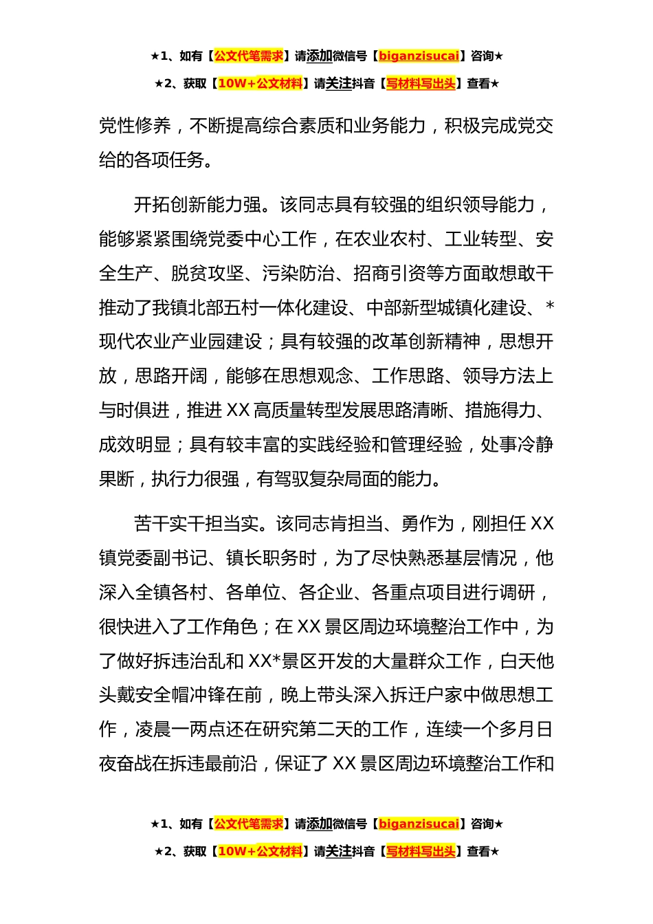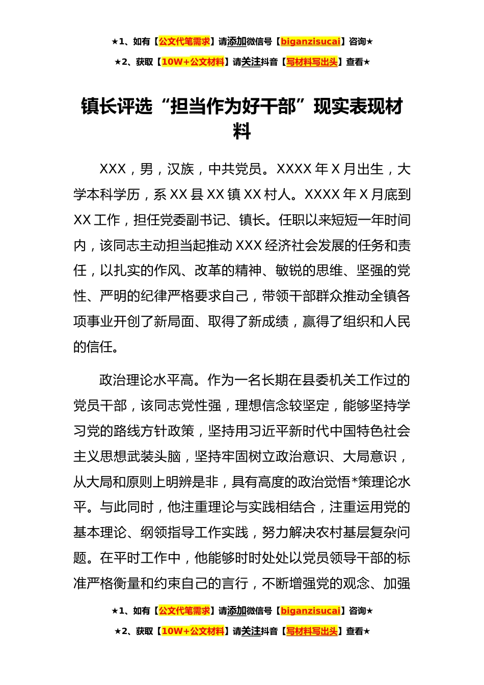 ★1、如有【公文代笔需求】请添加微信号【biganzisucai】咨询★★2、获取【10W+公文材料】请关注抖音【写材料写出头】查看★镇长评选“担当作为好干部”现实表现材料XXX,男,汉族,中共党员。XXXX年X月出生,大学本科学历,系XX县XX镇XX村人。XXXX年X月底到XX工作,担任党委副书记、镇长。任职以来短短一年时间内,该同志主动担当起推动XXX经济社会发展的任务和责任,以扎实的作风、改革的精神、敏锐的思维、坚强的党性、严明的纪律严格要求自己,带领干部群众推动全镇各项事业开创了新局面、取得了新成绩,赢得了组织和人民的信任。政治理论水平高。作为一名长期在县委机关工作过的党员干部,该同志党性强,理想信念较坚定,能够坚持学习党的路线方针政策,坚持用习近平新时代中国特色社会主义思想武装头脑,坚...