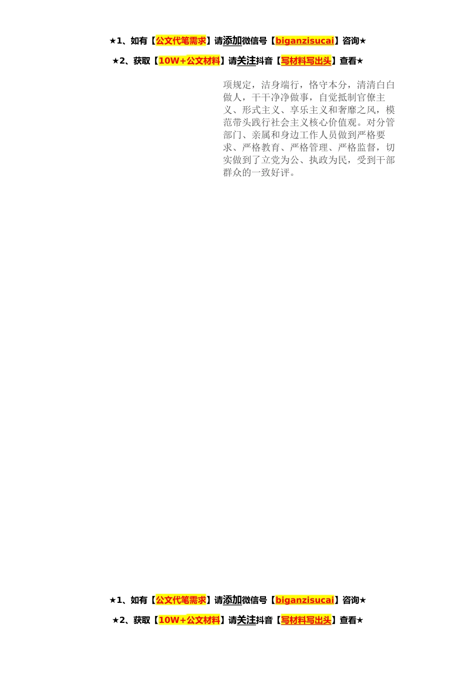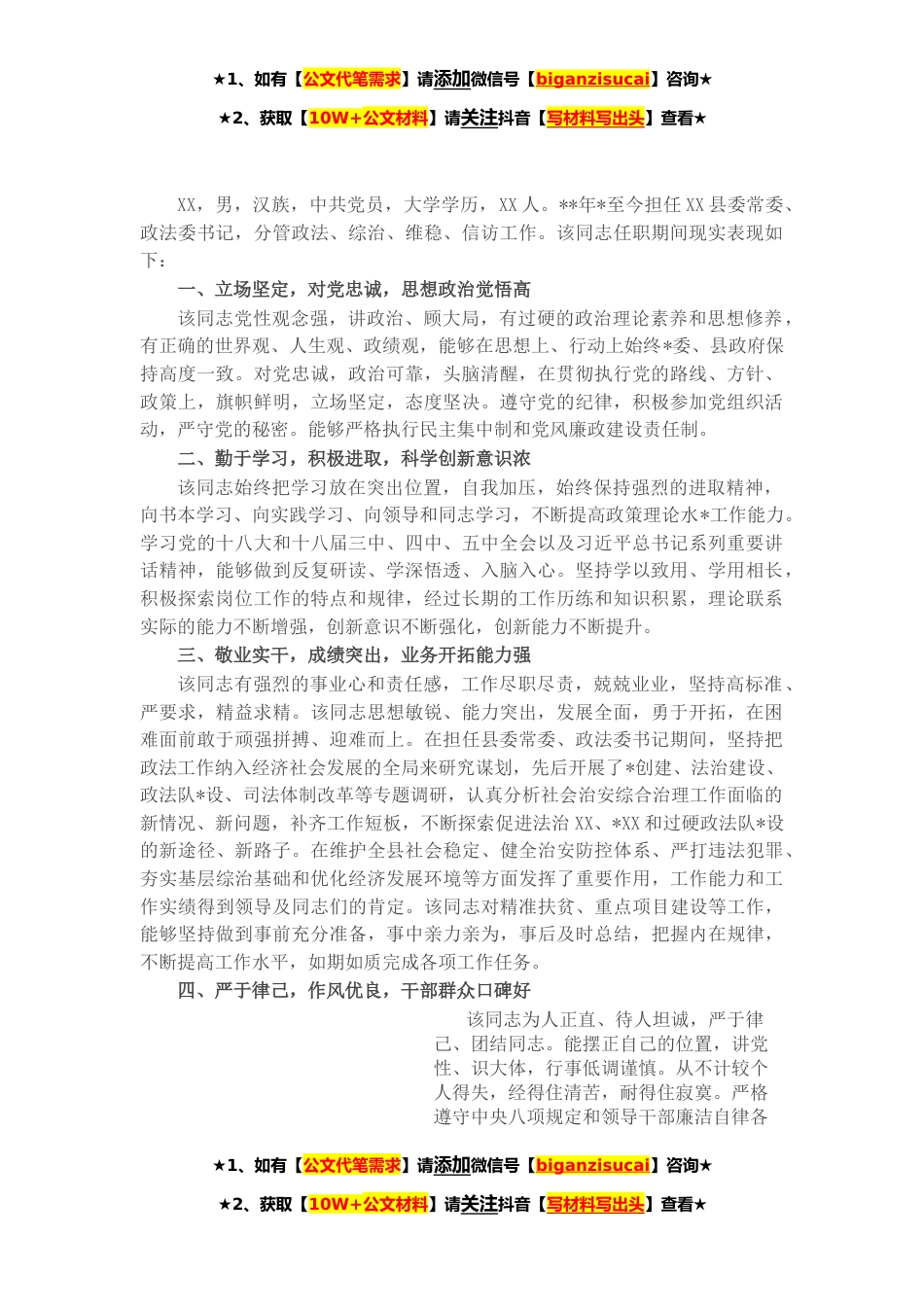 ★1、如有【公文代笔需求】请添加微信号【biganzisucai】咨询★★2、获取【10W+公文材料】请关注抖音【写材料写出头】查看★XX,男,汉族,中共党员,大学学历,XX人。**年*至今担任XX县委常委、政法委书记,分管政法、综治、维稳、信访工作。该同志任职期间现实表现如下:一、立场坚定,对党忠诚,思想政治觉悟高该同志党性观念强,讲政治、顾大局,有过硬的政治理论素养和思想修养,有正确的世界观、人生观、政绩观,能够在思想上、行动上始终*委、县政府保持高度一致。对党忠诚,政治可靠,头脑清醒,在贯彻执行党的路线、方针、政策上,旗帜鲜明,立场坚定,态度坚决。遵守党的纪律,积极参加党组织活动,严守党的秘密。能够严格执行民主集中制和党风廉政建设责任制。二、勤于学习,积极进取,科学创新意识浓...