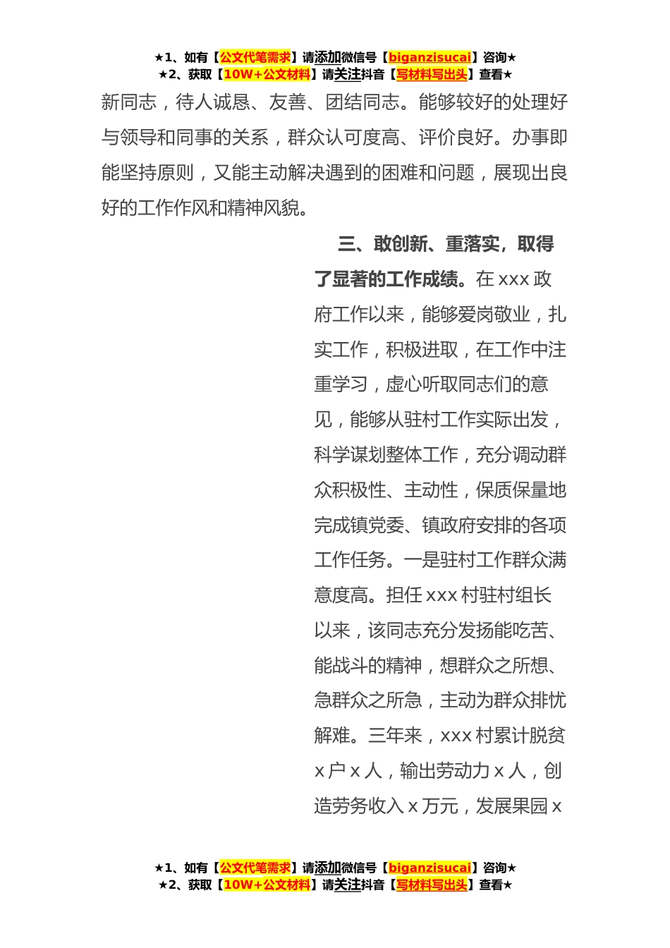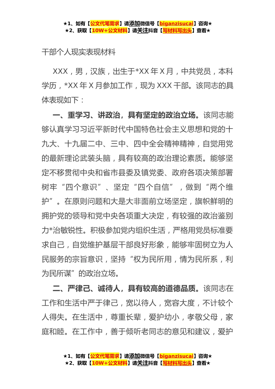 ★1、如有【公文代笔需求】请添加微信号【biganzisucai】咨询★★2、获取【10W+公文材料】请关注抖音【写材料写出头】查看★干部个人现实表现材料XXX,男,汉族,出生于*XX年X月,中共党员,本科学历,*XX年X月参加工作,现为XXX干部。该同志的具体表现如下:一、重学习、讲政治,具有坚定的政治立场。该同志能够认真学习习近平新时代中国特色社会主义思想和党的十九大、十九届二中、三中、四中全会精神精神,自觉用党的最新理论武装头脑,具有较高的政治理论素质。能够坚定不移贯彻中央和省市县委及镇党委、政府各项决策部署树牢“四个意识”、坚定“四个自信”,做到“两个维护”。在原则问题和大是大非面前立场坚定,旗帜鲜明的拥护党的领导和党中央各项重大决定,有较强的政治鉴别力*治敏锐性。积极参加党内组...