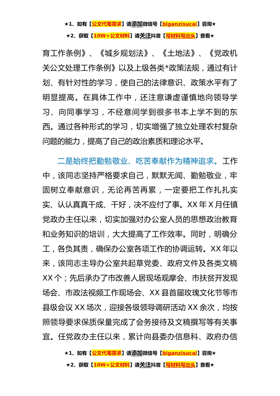 ★1、如有【公文代笔需求】请添加微信号【biganzisucai】咨询★★2、获取【10W+公文材料】请关注抖音【写材料写出头】查看★乡镇党政办主任现实表现材料XXX,男,汉族,XX年X月出生,XX县XX人,中共党员,本科学历,现任XX镇党政办主任。该同志自参加工作以来,政治立场坚定,对党忠诚老实,模范遵守党的廉洁自律规定,勤勉履职,敢于担当,连年被镇党委政府评为先进工作者,其中,XX年、XX年连续*被县政府评为政府系统办公室先进工作者;XX年X“月被县委授予优秀”共产党员荣誉称号;XX年X月被县委县政府评为XX年度脱贫攻坚先进工作者。一是始终把坚定信念、提升素质作为首要标准。无论“在什么样的工作岗位上,该同志都坚持把完善自身,提高”能力作为第一要务,抽时间、挤时间加强各方面知识的学习。去年以来,...
