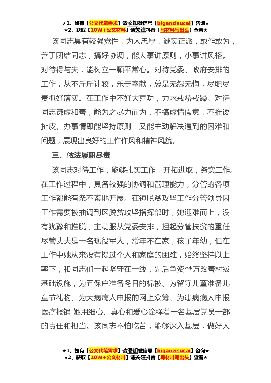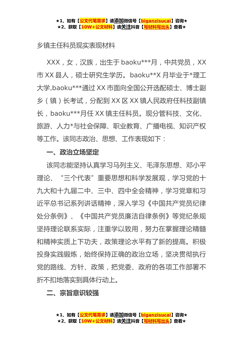 ★1、如有【公文代笔需求】请添加微信号【biganzisucai】咨询★★2、获取【10W+公文材料】请关注抖音【写材料写出头】查看★乡镇主任科员现实表现材料XXX,女,汉族,出生于baoku***月,中共党员,XX市XX县人,硕士研究生学历。baoku**X月毕业于*理工大学,baoku***通过XX市面向全国公开选配硕士、博士副乡(镇)长考试,分配到XX区XX镇人民政府任科技副镇长,baoku***月任XX镇主任科员。现分管科技、文化、旅游、人力*与社会保障、职业教育、广播电视、知识产权等工作。该同志政治、思想、工作表现如下:一、政治立场坚定该同志能坚持认真学习马列主义、毛泽东思想、邓小平理论、“三个代表”重要思想和科学发展观,学习党的十九大和十九届二中、三中、四中全会精神,学习党章和习近平总书记系列讲话精神,深入学...