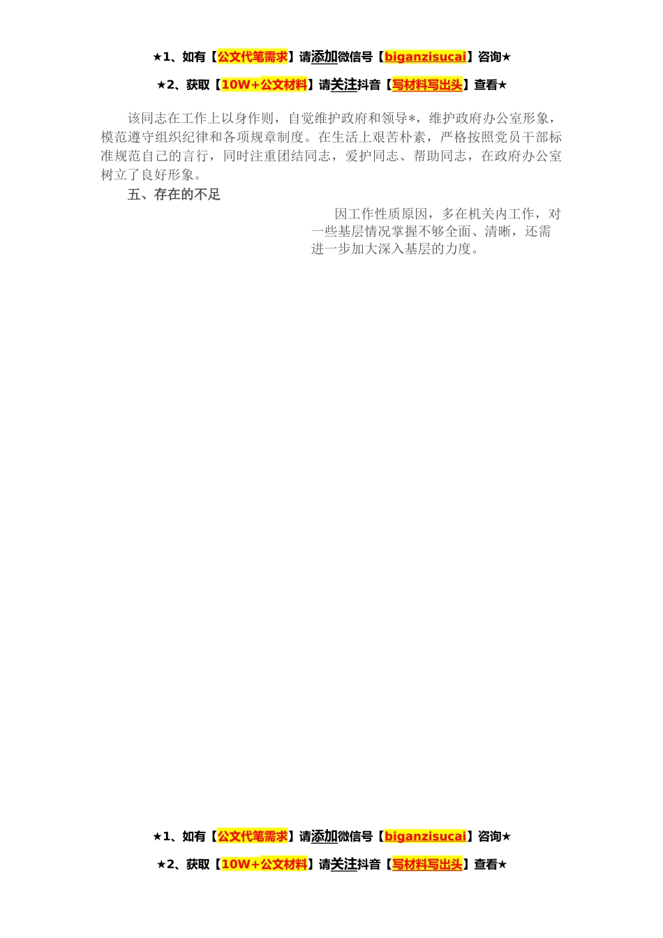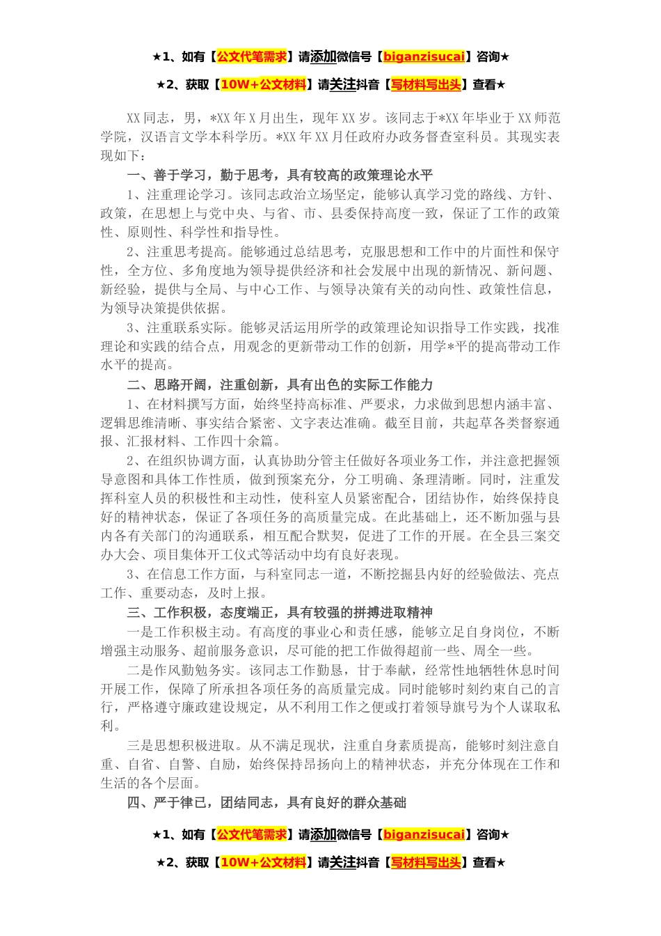 ★1、如有【公文代笔需求】请添加微信号【biganzisucai】咨询★★2、获取【10W+公文材料】请关注抖音【写材料写出头】查看★XX同志,男,*XX年X月出生,现年XX岁。该同志于*XX年毕业于XX师范学院,汉语言文学本科学历。*XX年XX月任政府办政务督查室科员。其现实表现如下:一、善于学习,勤于思考,具有较高的政策理论水平1、注重理论学习。该同志政治立场坚定,能够认真学习党的路线、方针、政策,在思想上与党中央、与省、市、县委保持高度一致,保证了工作的政策性、原则性、科学性和指导性。2、注重思考提高。能够通过总结思考,克服思想和工作中的片面性和保守性,全方位、多角度地为领导提供经济和社会发展中出现的新情况、新问题、新经验,提供与全局、与中心工作、与领导决策有关的动向性、政策性信息,为...