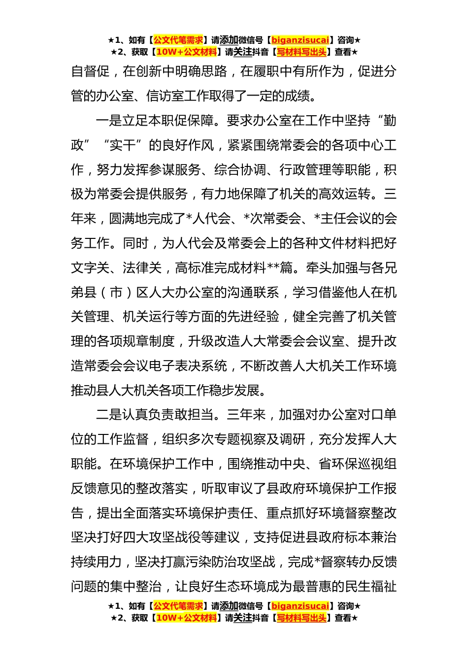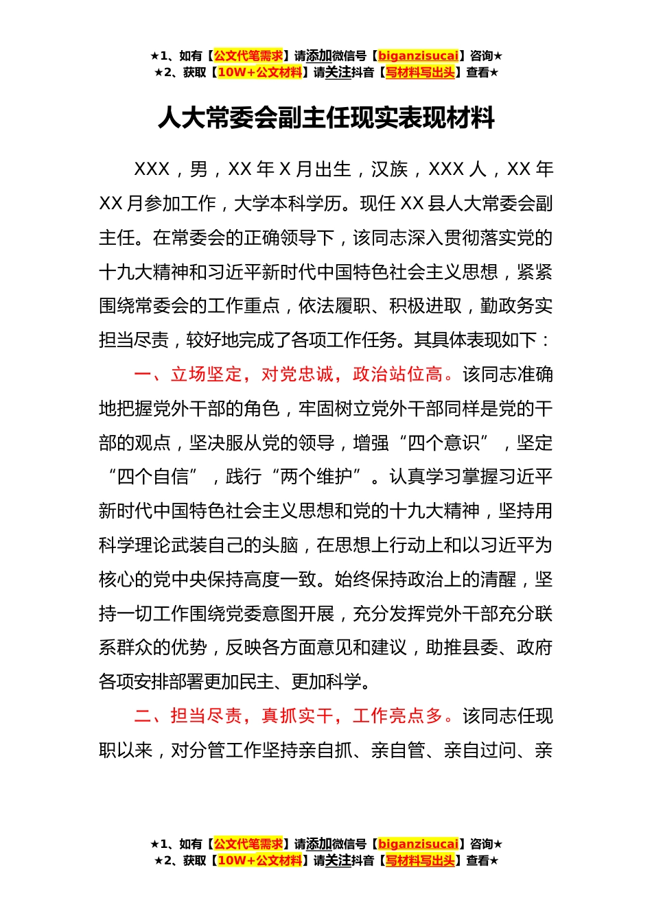 ★1、如有【公文代笔需求】请添加微信号【biganzisucai】咨询★★2、获取【10W+公文材料】请关注抖音【写材料写出头】查看★人大常委会副主任现实表现材料XXX,男,XX年X月出生,汉族,XXX人,XX年XX月参加工作,大学本科学历。现任XX县人大常委会副主任。在常委会的正确领导下,该同志深入贯彻落实党的十九大精神和习近平新时代中国特色社会主义思想,紧紧围绕常委会的工作重点,依法履职、积极进取,勤政务实担当尽责,较好地完成了各项工作任务。其具体表现如下:一、立场坚定,对党忠诚,政治站位高。该同志准确地把握党外干部的角色,牢固树立党外干部同样是党的干部的观点,坚决服从党的领导,增强“四个意识”,坚定“四个自信”,践行“两个维护”。认真学习掌握习近平新时代中国特色社会主义思想和党的十...