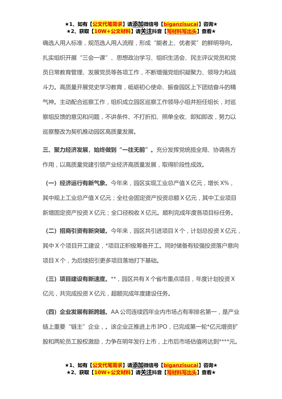 ★1、如有【公文代笔需求】请添加微信号【biganzisucai】咨询★★2、获取【10W+公文材料】请关注抖音【写材料写出头】查看★今年来,在市委市政府坚强领导下,本人始终坚持以习近平新时代中国特色社会主义思想为指导,紧盯省委省政府工作部署,贯彻市委市政府中心工作安排,立足园区定位及实际,把握新发展阶段、贯彻新发展理念、构建新发展格局,推动高质量发展,全力以赴推进新时代党的建设新的伟大工程,夯实团结奋进的思想政治基础,凝聚园区上下担当作为、锐意进取、攻坚克难的强大精神力量,赋能园区高质量发展。一、坚定理想信念,始终做到“一心向党”。将党工委会议第一议题固定为学习习近平总书记重要讲话和重要指示批示精神,确保在政治上、思想上、行动上始终同以习近平总书记为核心的党中央保持高度...
