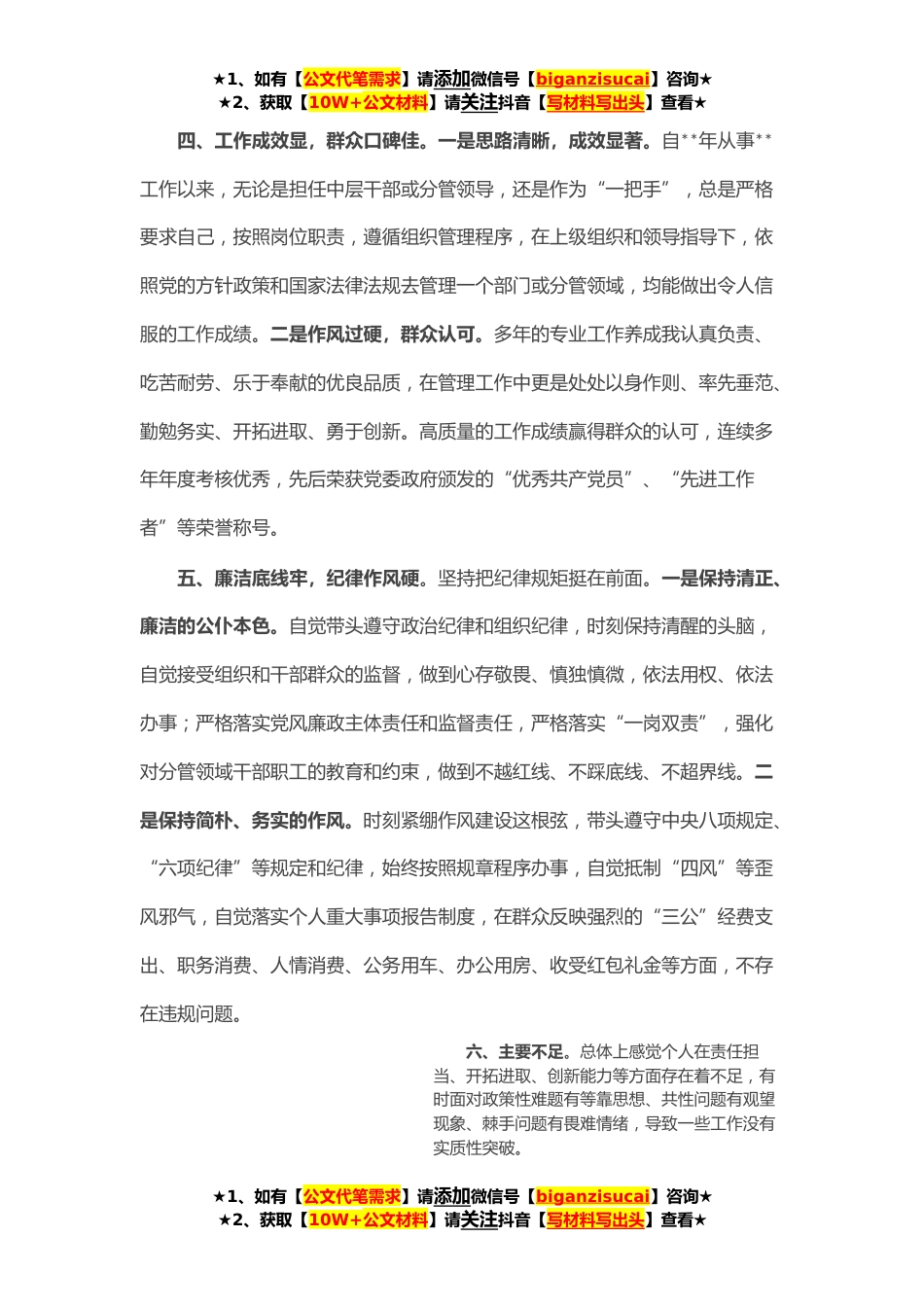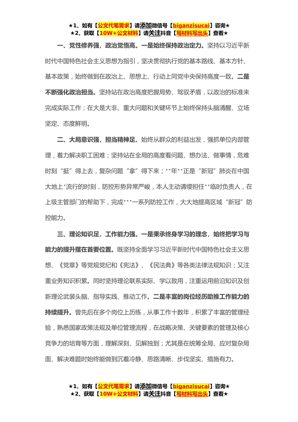 ★1、如有【公文代笔需求】请添加微信号【biganzisucai】咨询★★2、获取【10W+公文材料】请关注抖音【写材料写出头】查看★一、党性修养强,政治觉悟高。一是始终保持政治定力。坚持以习近平新时代中国特色社会主义思想为指引,坚决贯彻执行党的基本路线、基本方针、基本政策,始终做到在政治上、思想上、行动上同党中央保持高度一致。二是不断强化政治担当。坚持站在政治高度把握局势、驾驭矛盾,以政治的标准来完成实际工作;在大是大非、重大问题和关键环节上始终保持头脑清醒、立场坚定、态度鲜明。二、大局意识强,担当精神足。始终从群众的利益出发,强抓单位内部管理,着力解决职工困难;坚持站在全局的高度看问题、想办法、做事情,危难时刻“挺”得上去,复杂问题“拿”得下来;**年**正是“新冠”肺炎...