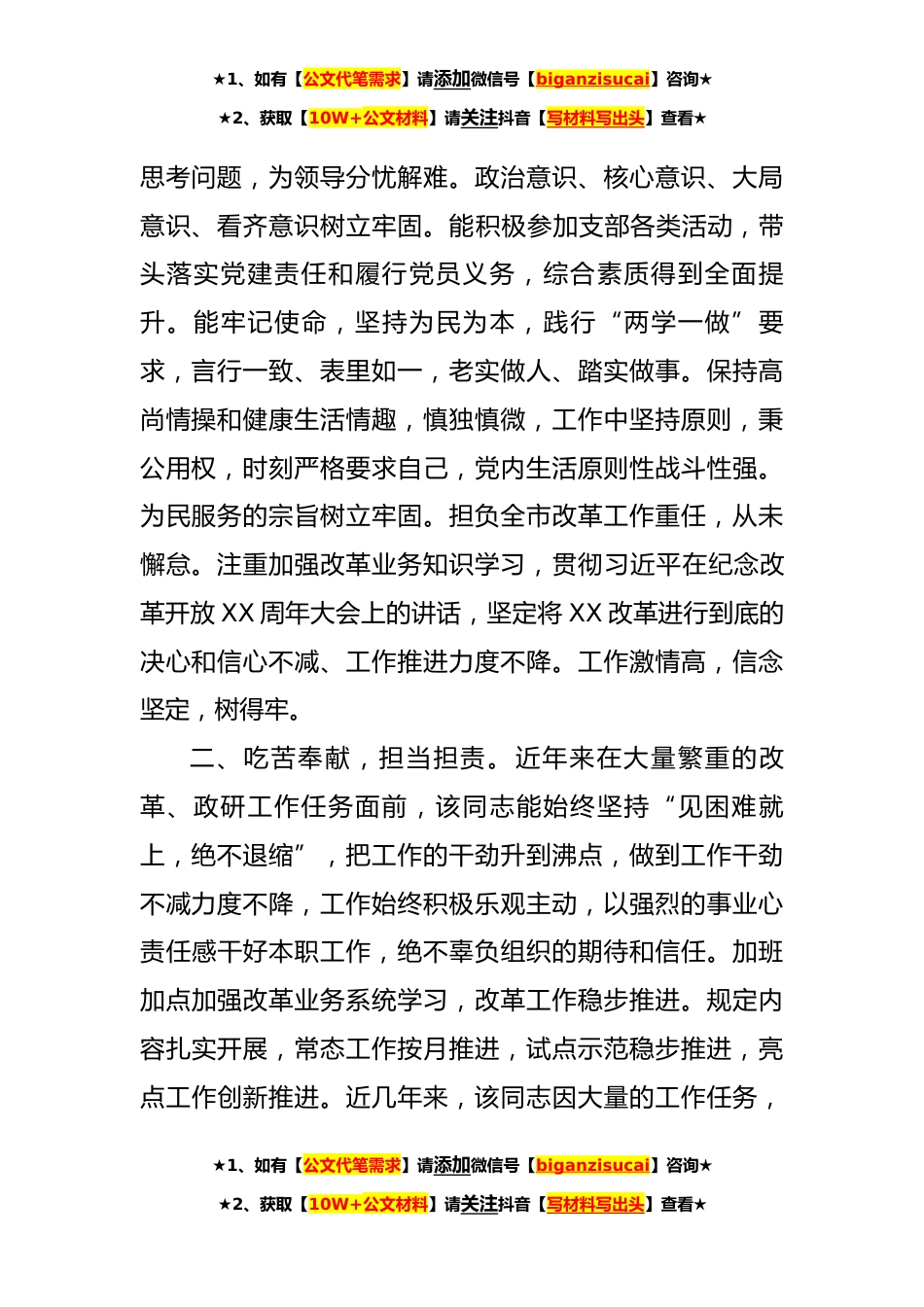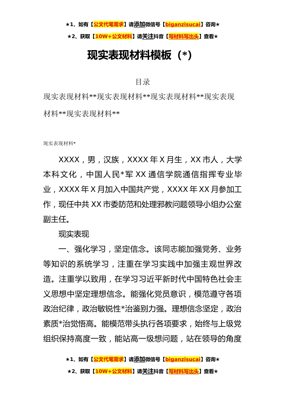 ★1、如有【公文代笔需求】请添加微信号【biganzisucai】咨询★★2、获取【10W+公文材料】请关注抖音【写材料写出头】查看★现实表现材料模板(*)目录现实表现材料**现实表现材料**现实表现材料**现实表现材料**现实表现材料**现实表现材料*XXXX,男,汉族,XXXX年X月生,XX市人,大学本科文化,中国人民*军XX通信学院通信指挥专业毕业,XXXX年X月加入中国共产党,XXXX年XX月参加工作,现任中共XX市委防范和处理邪教问题领导小组办公室副主任。现实表现一、强化学习,坚定信念。该同志能加强党务、业务等知识的系统学习,注重在学习实践中加强主观世界改造。注重学以致用,在学习习近平新时代中国特色社会主义思想中坚定理想信念。能强化党员意识,模范遵守各项政治纪律,政治敏锐性*治鉴别力强。理想信念坚定,...