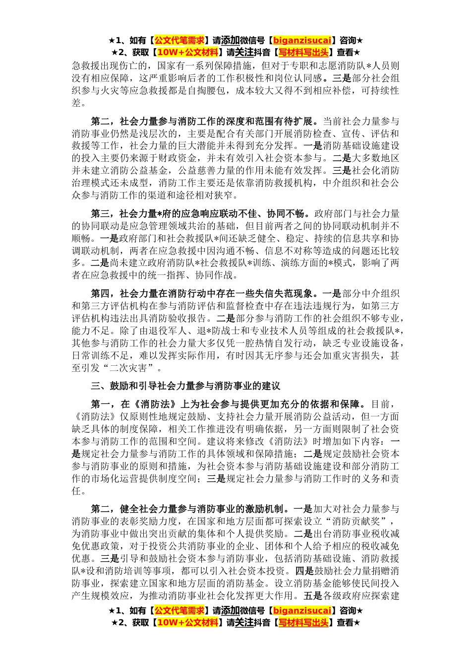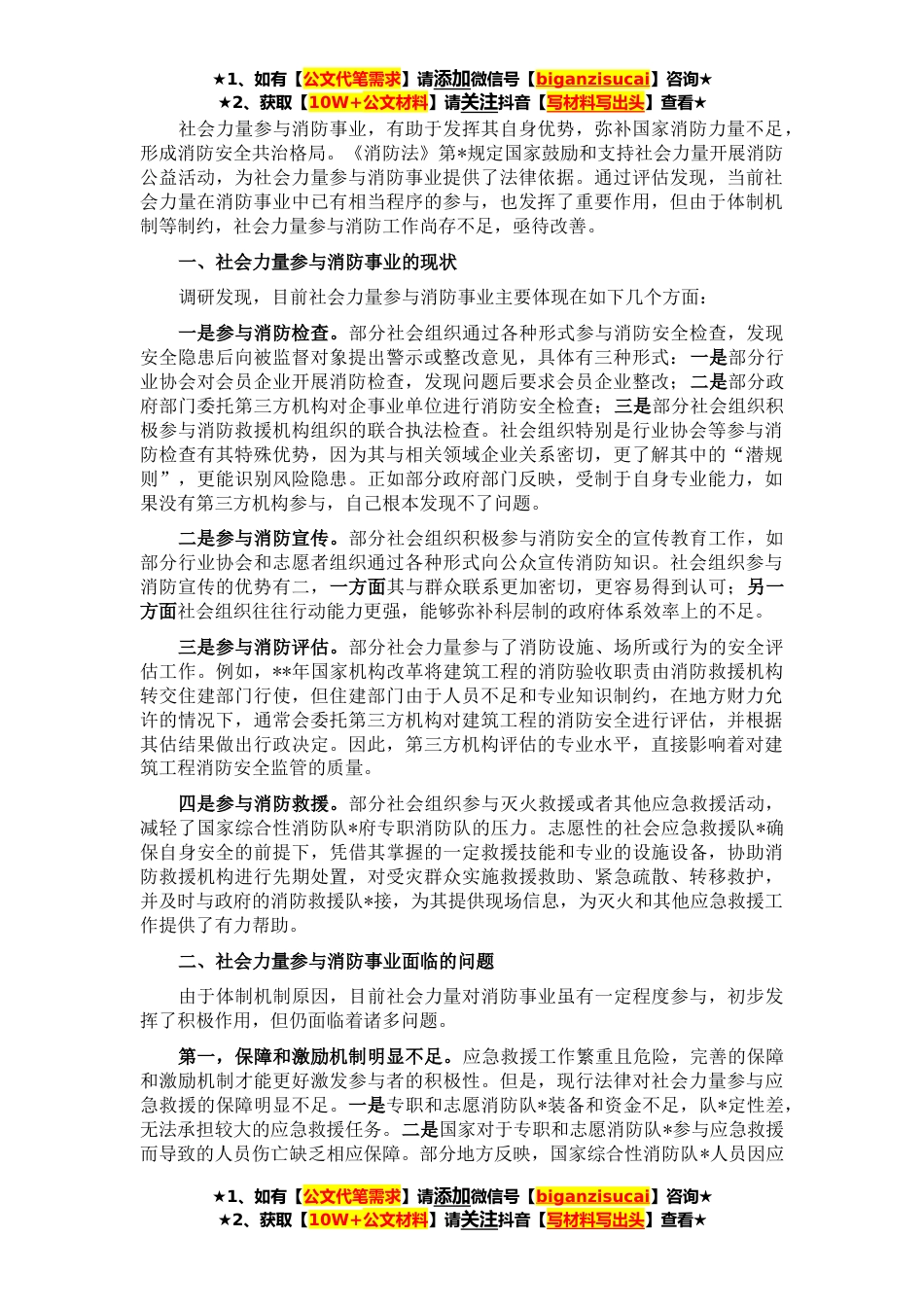 ★1、如有【公文代笔需求】请添加微信号【biganzisucai】咨询★★2、获取【10W+公文材料】请关注抖音【写材料写出头】查看★社会力量参与消防事业,有助于发挥其自身优势,弥补国家消防力量不足,形成消防安全共治格局。《消防法》第*规定国家鼓励和支持社会力量开展消防公益活动,为社会力量参与消防事业提供了法律依据。通过评估发现,当前社会力量在消防事业中已有相当程序的参与,也发挥了重要作用,但由于体制机制等制约,社会力量参与消防工作尚存不足,亟待改善。一、社会力量参与消防事业的现状调研发现,目前社会力量参与消防事业主要体现在如下几个方面:一是参与消防检查。部分社会组织通过各种形式参与消防安全检查,发现安全隐患后向被监督对象提出警示或整改意见,具体有三种形式:一是部分行业协会...