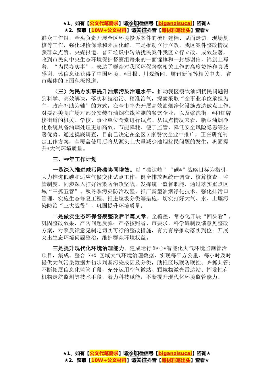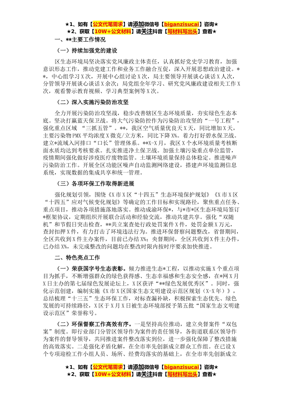 ★1、如有【公文代笔需求】请添加微信号【biganzisucai】咨询★★2、获取【10W+公文材料】请关注抖音【写材料写出头】查看★一、**主要工作情况(一)持续加强党的建设区生态环境局坚决落实党风廉政主体责任,认真抓好党史学习教育,加强意识形态工作,推动党建工作和业务工作融合互促,深入开展思想政治建设。**,中心组学习X次,开展中心组讨论X次,局主要领导开展谈心谈话X人次,分管领导开展谈心谈话X余次;局党组全年学习、研究党风廉政建设相关工作X次,观看警示教育视频、学习典型案例等X次。(二)深入实施污染防治攻坚全力开展污染防治攻坚战,稳步改善辖区生态环境质量,夯实绿色生态本底。坚决打赢蓝天保卫战。将大气污染防控作为污染防治攻坚的“一号工程”,强化重点区域“三抓五管”。**,我区空气...