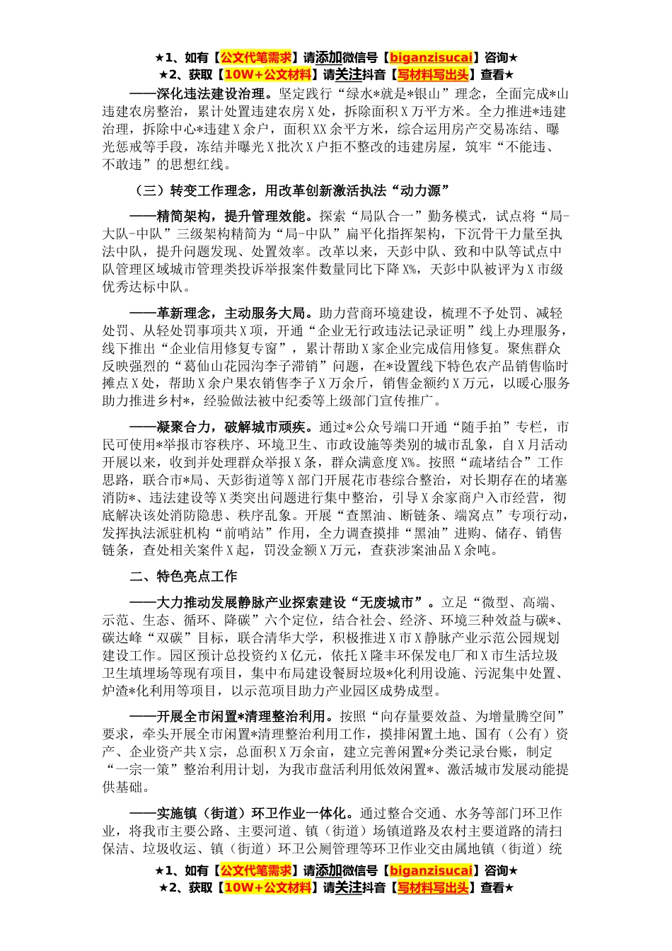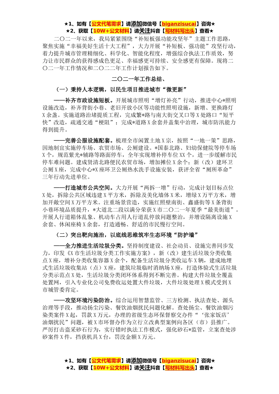 ★1、如有【公文代笔需求】请添加微信号【biganzisucai】咨询★★2、获取【10W+公文材料】请关注抖音【写材料写出头】查看★二〇二一年以来,我局紧紧围绕“补短板强功能攻坚年”主题工作思路,聚焦实施“幸福美好生活十大工程”,大力开展“补短板、强功能”攻坚行动,着力提升城市管理精细化、科学化、智能化程度,增强综合执法工作质效,努力让市民群众的获得感成色更足、幸福感更可持续、安全感更有保障。现将二〇二一年工作情况和二〇二二年工作计划报告如下。二〇二一年工作总结、(一)秉持人本逻辑,以民生项目推进城市“微更新”——补齐市政设施短板。开展城市照明“增灯补亮”行动,推进中心*照明设施改造,补齐背街小巷、老旧开放小区等功能性照明设施,新增、更换路灯X余盏。实施道路治堵提质工程,...